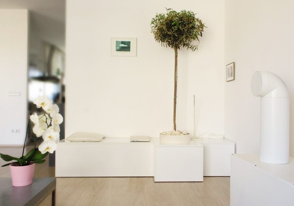 Intregul concept al apartamentului subscrie relatiei alb-gri, foarte prietenoasa cu lumina. Olivia ne ofera mai multe detalii legate optiunile de design interior ale spatiului lor personal: "Din fericire, avem gusturi comune si nu a existat niciodata vreo nepotrivire in acest sens. Spatiul este fluid, cu putine usi, punctat cromatic de nucleele verzi cu plante de interior. Pe langa orhidee, avem un maslin in jurul caruia s-a construit un obiect, tip banca sau loc de relaxare. In acest moment cred ca este locul cel mai drag noua. Am cautat diverse variante de interior cu copac built-in, conceptul de gradina inerioara sau copac interior fiind extrem de fascinant si cultivat in arhitectura contemporana cu precadere in spatii gandite pentru astfel de integrari".