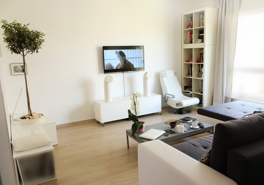 Spatiul deschis este dominat de mobilierul alb cu mici accente de gri beton si lumina directionata.
