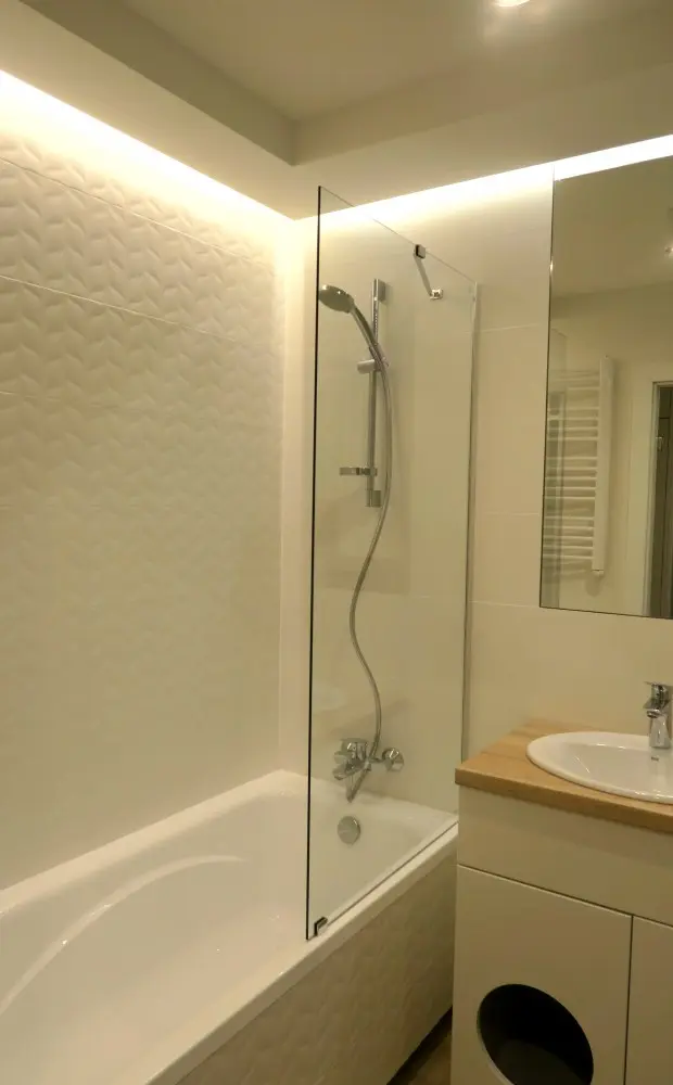 Si baia a trecut printr-o optimizare necesara. S-a pastrat cada, iar lavoarul a fost integrat intr-un corp de depozitare ce include si masina de spalat rufe. Pentru ca totul sa fie unitar, bazinul toaletei a fost incastrat, nisa creata oferind un plus de spatiu pentru a aseza mici decoratiuni de baie.