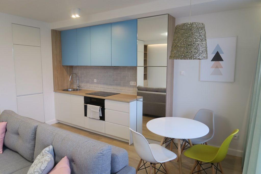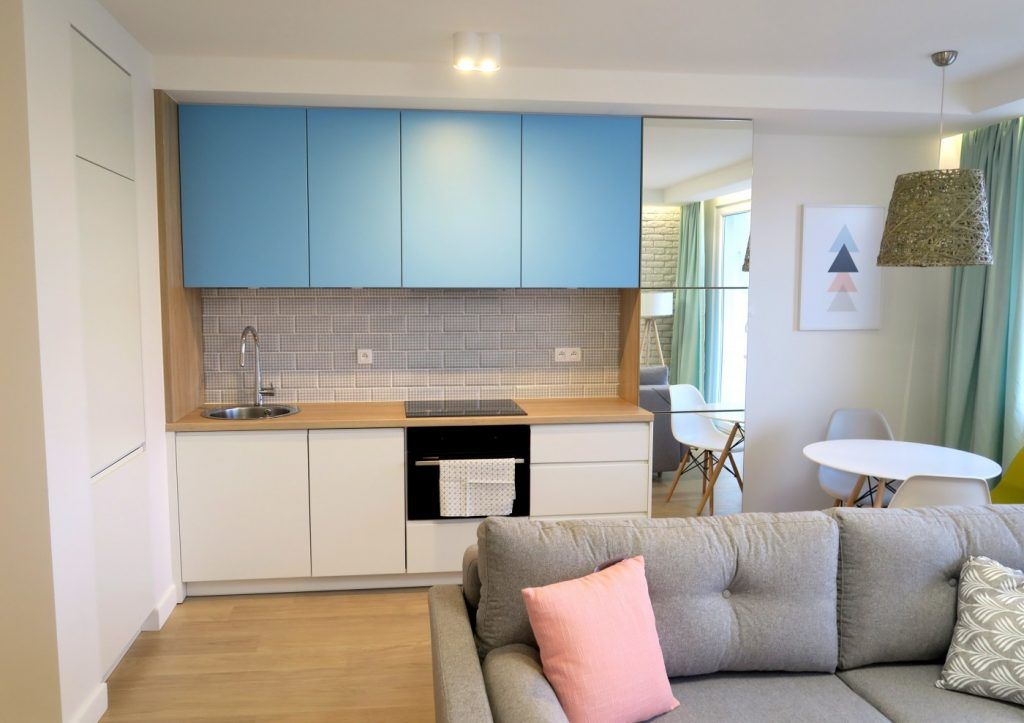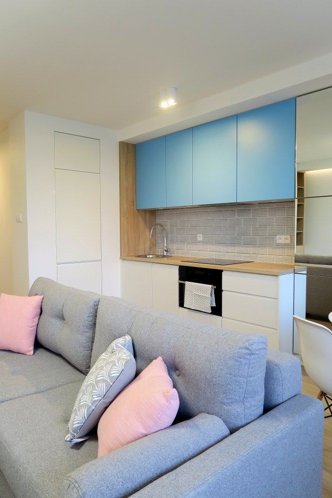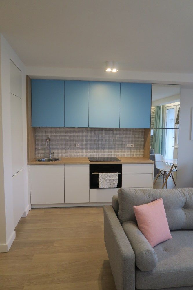 Pentru bucatarie, Karolina a ales o dispunere liniara, compacta, cu mobilier executat pe comanda. Contrastul alb-bleu, alaturi de esenta de lemn a blatului face ca atmosfera sa nu para incarcata, ci din contra, aerisita si luminoasa. Corpul cu usa acoperita de oglinda imprima profunzime, scopul fiind de a crea iluzia de spatiu mai mare. Imediat langa, a fost amenajat un mic loc de luat masa cu scaune colorate si corp de iluminat care atrage atentia prin textura sa.
