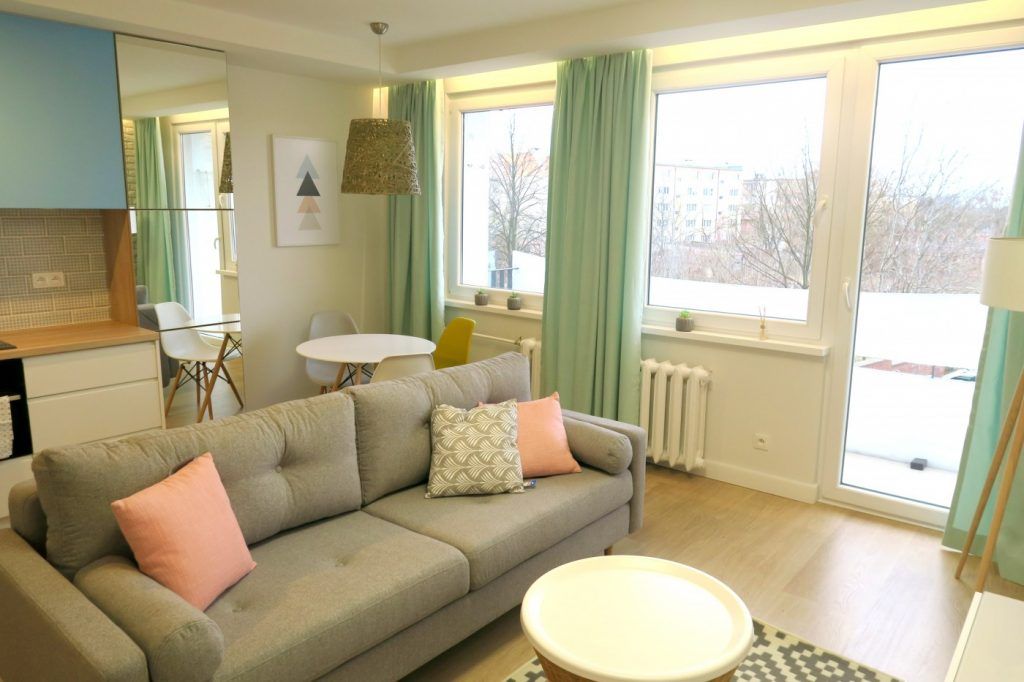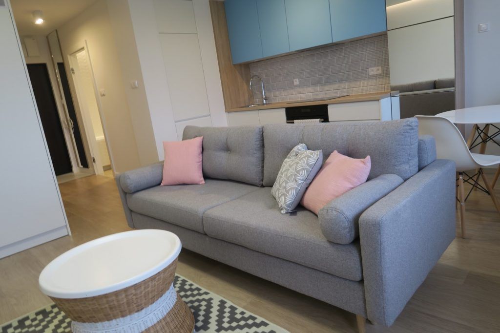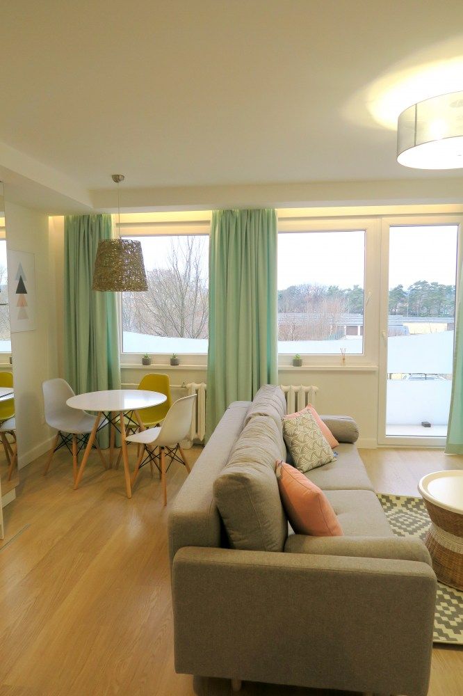 In centrul camerei a fost amplasata canapeaua, jucand si rol de partitie intre cele doua functiuni, bucatarie si living. O masuta de cafea, un lampadar si o consola pentru televizor sunt singurele accesorii care completeaza decorul. Cromatic, pernele decorative roz si perdelele verde pastel continua motivul pastelurilor pe care il regasim in bucatarie.
