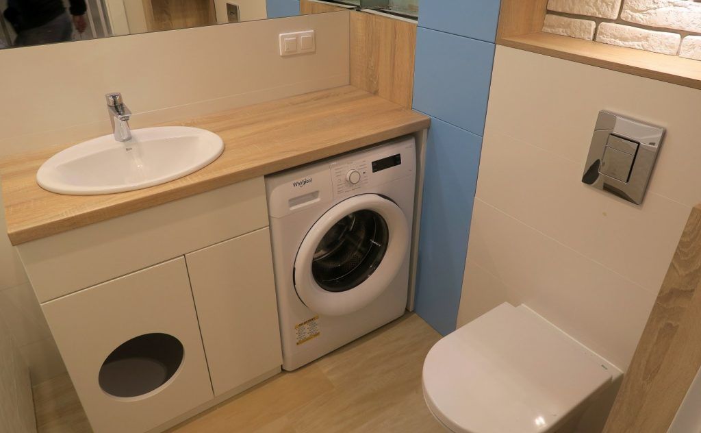 Si baia a trecut printr-o optimizare necesara. S-a pastrat cada, iar lavoarul a fost integrat intr-un corp de depozitare ce include si masina de spalat rufe. Pentru ca totul sa fie unitar, bazinul toaletei a fost incastrat, nisa creata oferind un plus de spatiu pentru a aseza mici decoratiuni de baie.