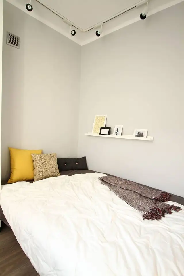 Partea surprinzatoare a acestei amenajari este crearea unui spatiu de dormit in spatele partitiei colorate in pastel. Patul, dulapul pentru haine si un lampadar minimalist asigura decorul acestei functiuni nou create in acest apartament. Zona de zi este astfel delimitata de cea de noapte, oferind un plus de intimitate in cazul vizitelor prietenilor.