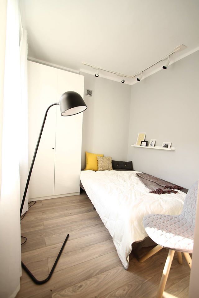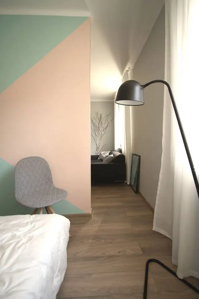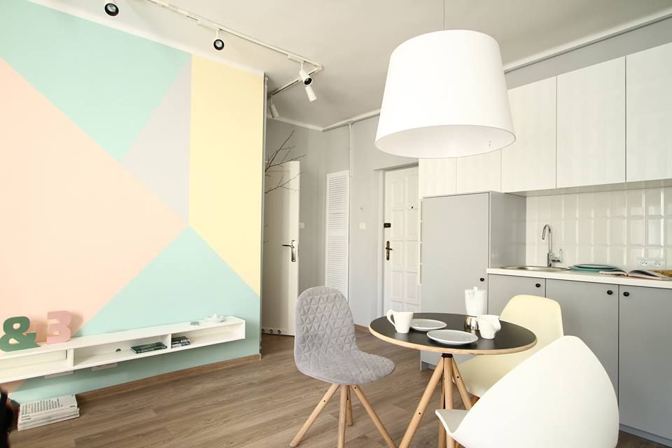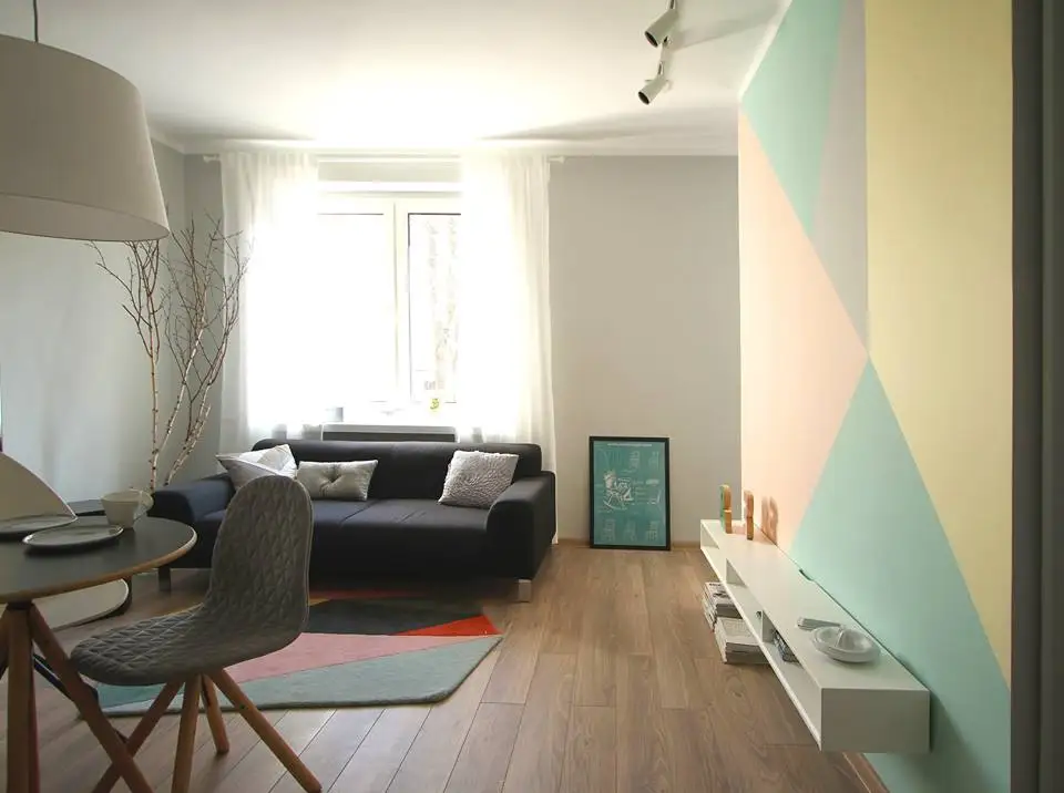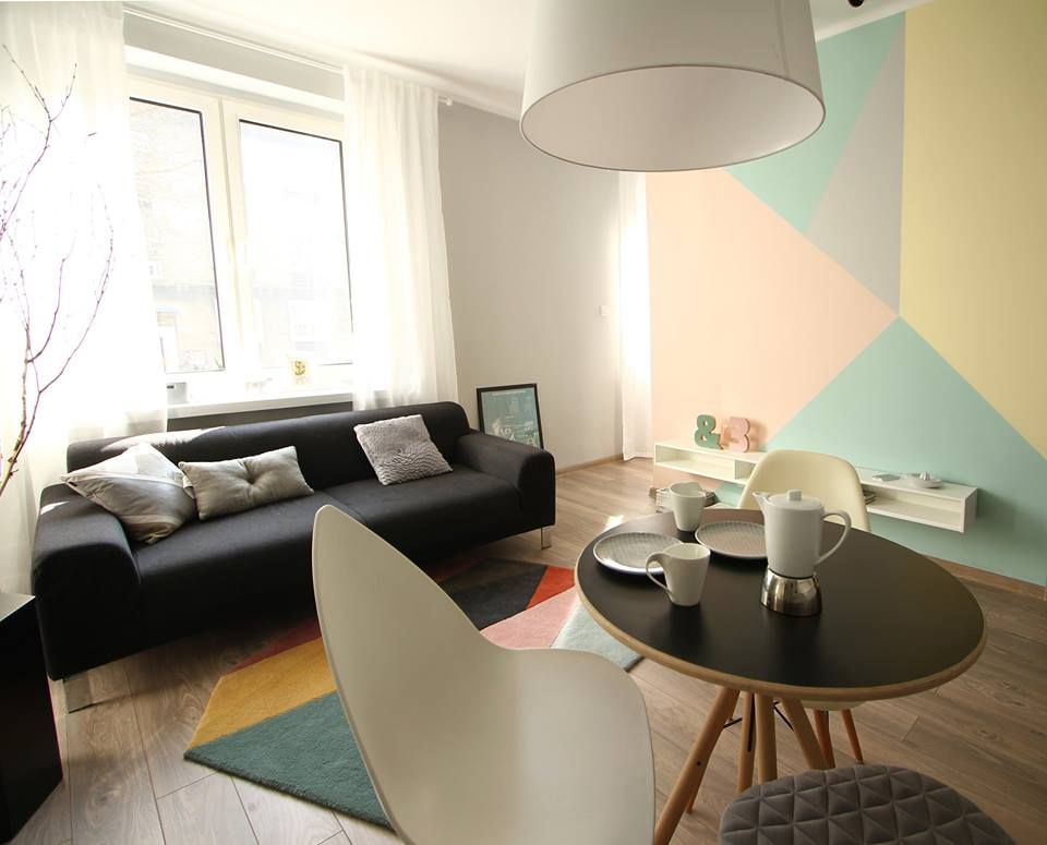 Pastelurile de pe peretele-accent isi regasesc corespondentul in modelul covorului, iar oglinzile dulapului reflecta tot acest joc geometric, lasand impresia ca spatiul pare mai mare. Restul peretilor au fost zugraviti cu un gri in ton deschis.