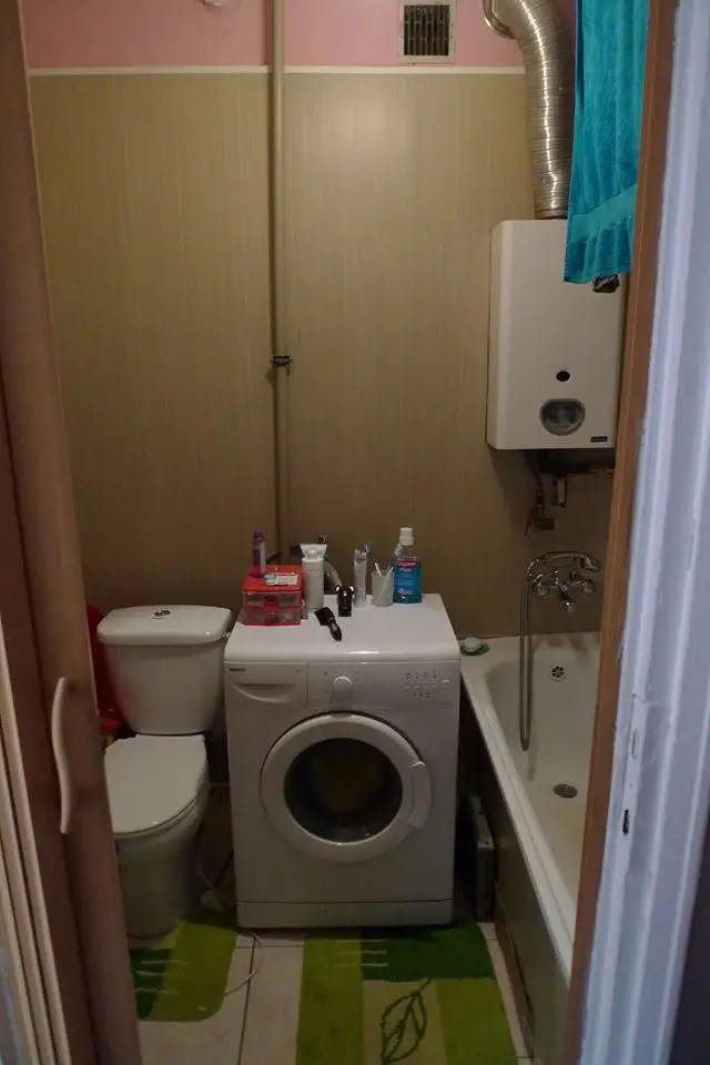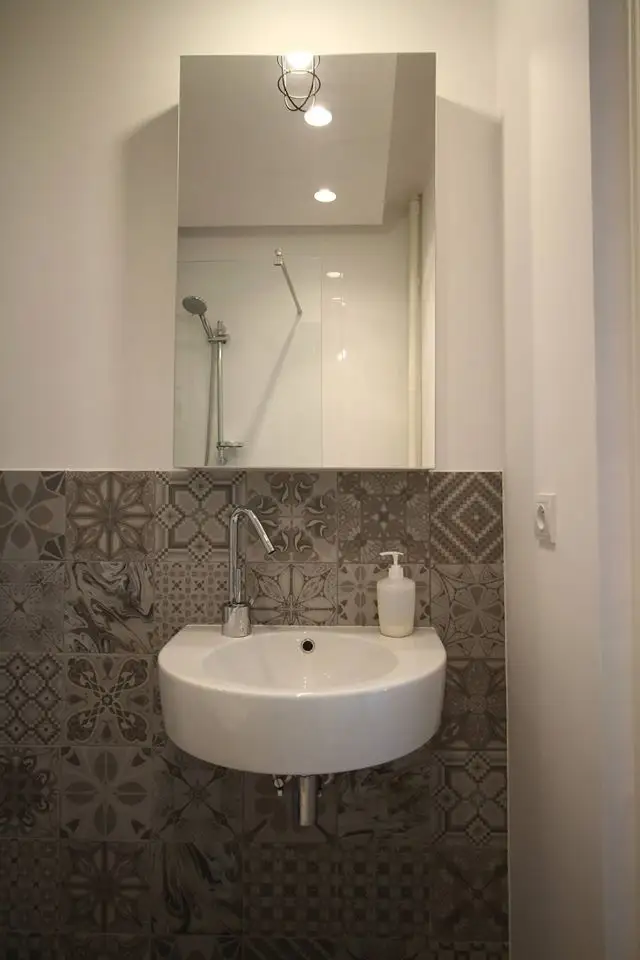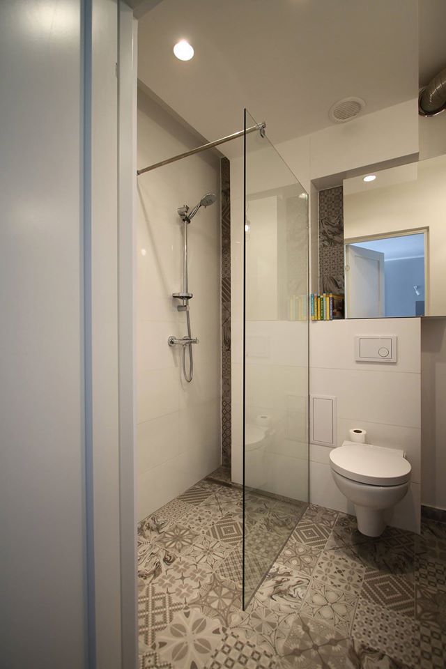 In baie, eliminand cada si inlocuind-o cu un dus cu scurgere in pardoseala, s-a putut integra aici si masina de spalat rufe.