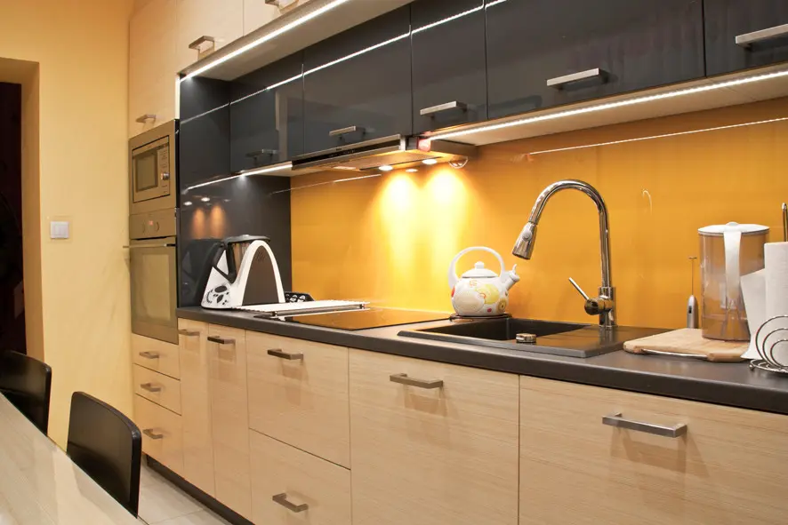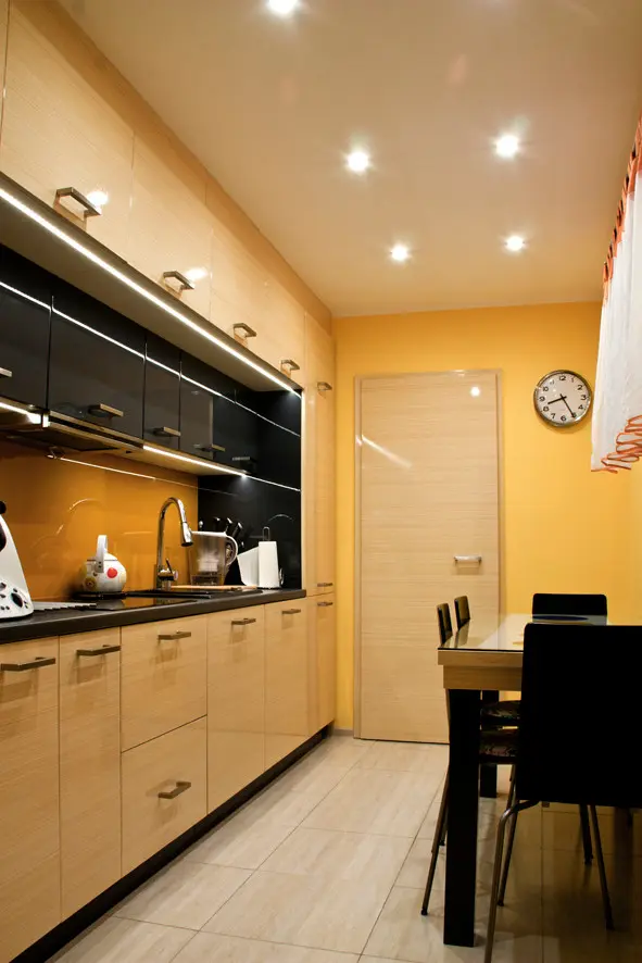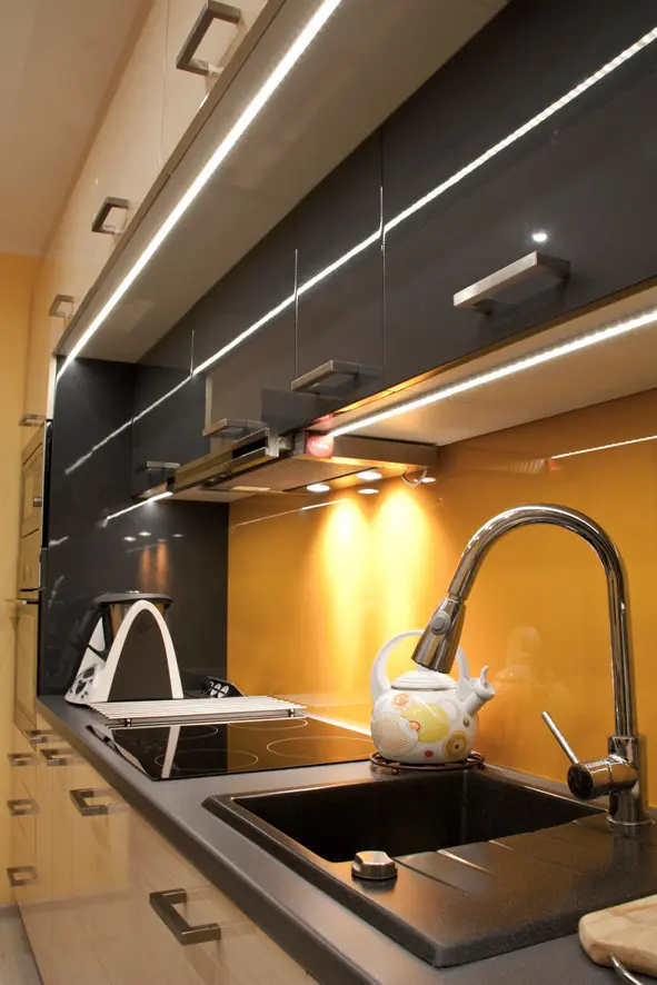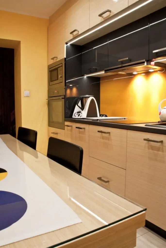 Intre corpurile de sus si cele de jos, s-a montat un panou din sticla galbena. O nuanta similara o vom gasi si pe pereti. Astfel, intreaga incapere pare mai luminoasa si mai primitoare. Un rol important il joaca aici si spoturile incastrate in tavan care asigura uniluminat uniform.