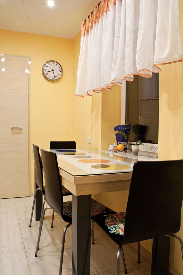 Intre corpurile de sus si cele de jos, s-a montat un panou din sticla galbena. O nuanta similara o vom gasi si pe pereti. Astfel, intreaga incapere pare mai luminoasa si mai primitoare. Un rol important il joaca aici si spoturile incastrate in tavan care asigura uniluminat uniform.