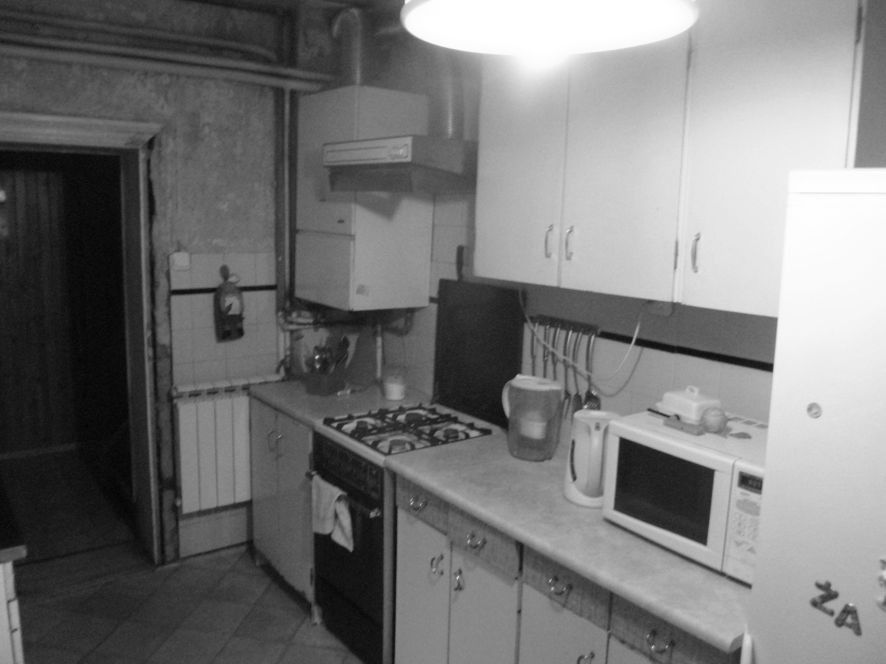 Mobilierul realizat pe comanda dupa schitele designerului este distribuit pe intreaga lungime a peretelui, iar spatiul pe verticala este optim utilizat. Dispunerea este liniara, compacta. Electrocasnicele au fost incorporate, intr-un capat fiind asezat frigiderul si, in cealalta parte, cuptorul si cuptorul cu microunde.