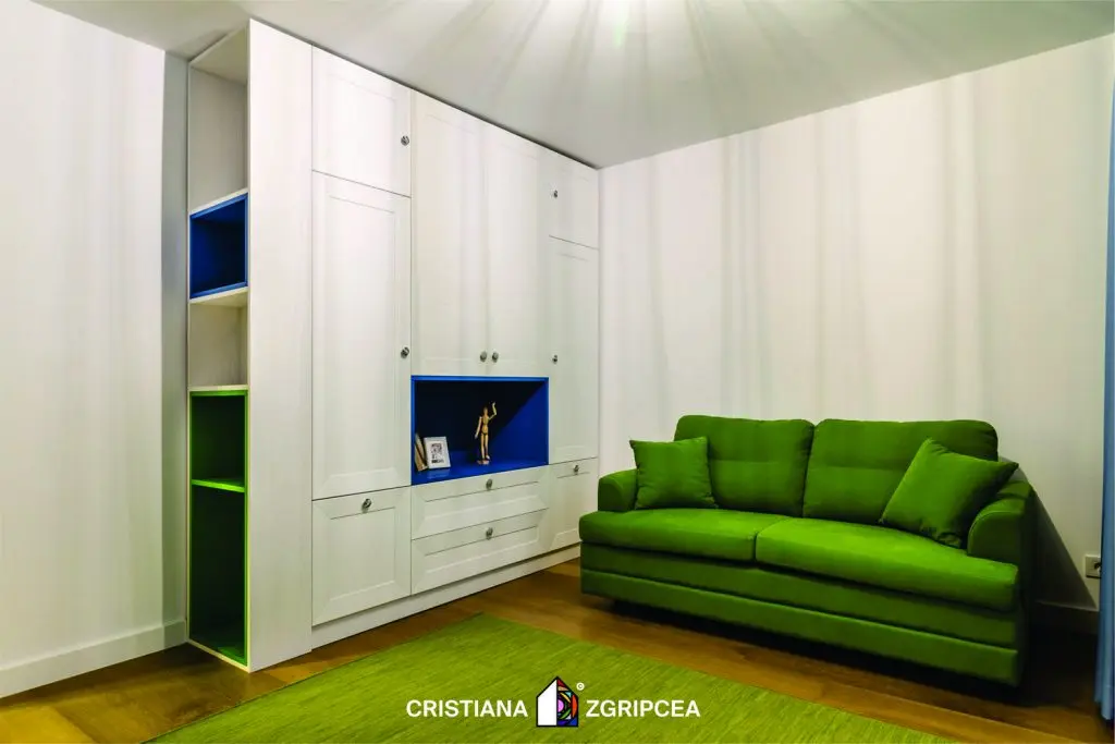 Deschide GaleriaBeneficiarii, o familie cu un copil, au trasat cateva directii precise Cristianei: isi doreau o amenajare luminoasa, colorata si cu cat mai multe spatii de depozitare, intr-un stil modern.