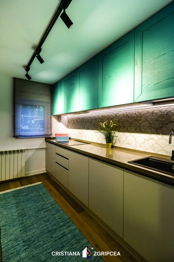Pentru bucatarie s-a urmarit aceeasi linie, avand o separare discreta a zonei de gatit de cea pentru luat masa. De o parte avem corpurile principale, compact dispuse si cu electrocasnicele incorporate, iar in capatul opus, un corp suplimentar care inglobeaza frigiderul, cuptoarele si un mic spatiu de depozitare pe lateral. Iluminatul variat permite diferite scenarii de la spatiul pentru luat masa pana la blatul de lucru. Pentru un plus de fluenta a circulatiilor, usa batanta a fost inlocuita cu una glisanta.