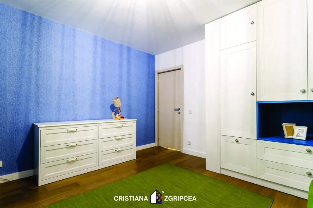 In fiecare din cele trei dormitoare a fost conturat cate un perete-accent realizat cu tapet de la Grandeco. Printr-o astfel de abordare, Cristiana si-a dorit sa realizeze un contrast cromatic intre zona accent si mobilier. La nivelul bailor s-au folosit finisaje cu aspect natural, iar accentul de culoare a fost aplicat la blaturile de mobila ce sustin lavoarele.