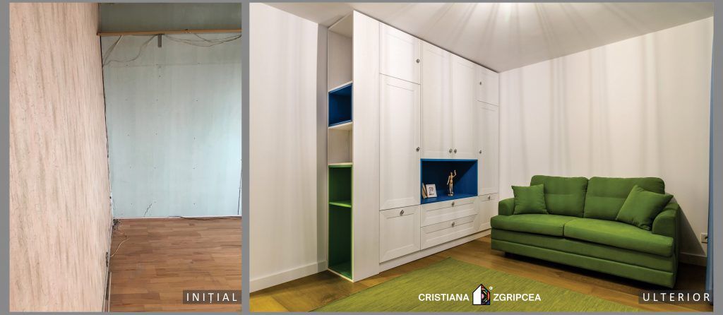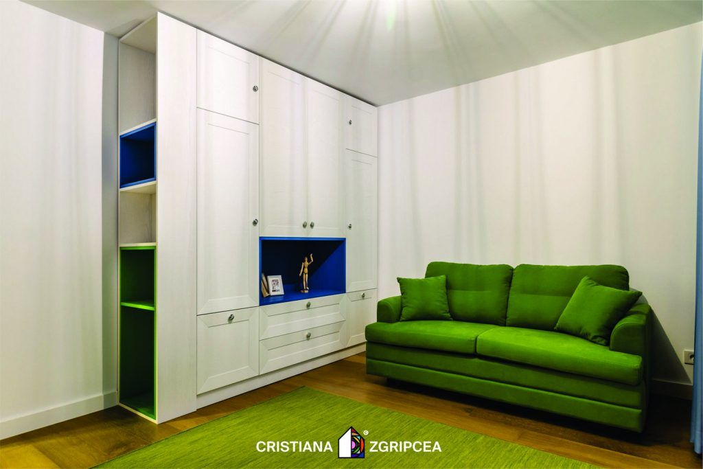 Deschide GaleriaBeneficiarii, o familie cu un copil, au trasat cateva directii precise Cristianei: isi doreau o amenajare luminoasa, colorata si cu cat mai multe spatii de depozitare, intr-un stil modern.
