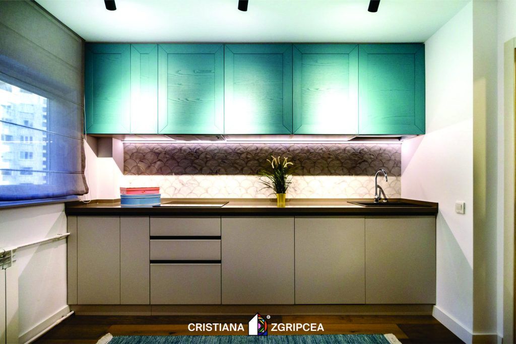 Pentru bucatarie s-a urmarit aceeasi linie, avand o separare discreta a zonei de gatit de cea pentru luat masa. De o parte avem corpurile principale, compact dispuse si cu electrocasnicele incorporate, iar in capatul opus, un corp suplimentar care inglobeaza frigiderul, cuptoarele si un mic spatiu de depozitare pe lateral. Iluminatul variat permite diferite scenarii de la spatiul pentru luat masa pana la blatul de lucru. Pentru un plus de fluenta a circulatiilor, usa batanta a fost inlocuita cu una glisanta.