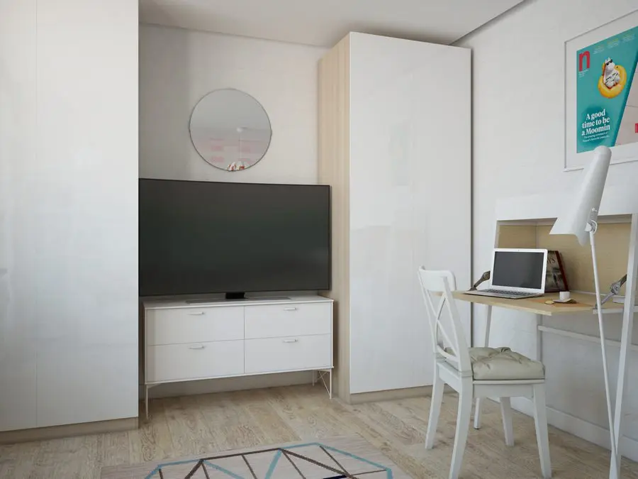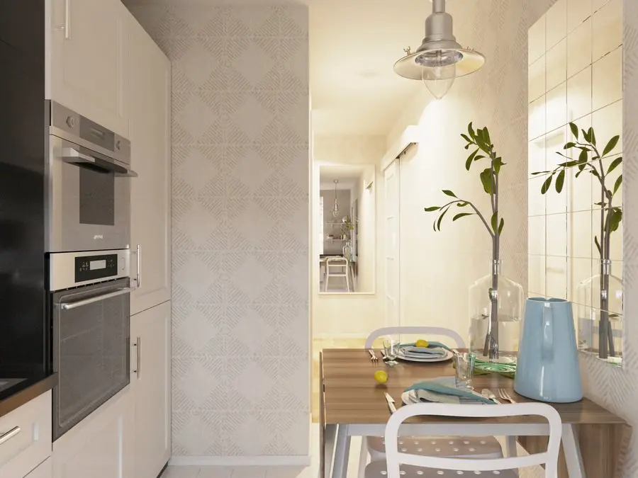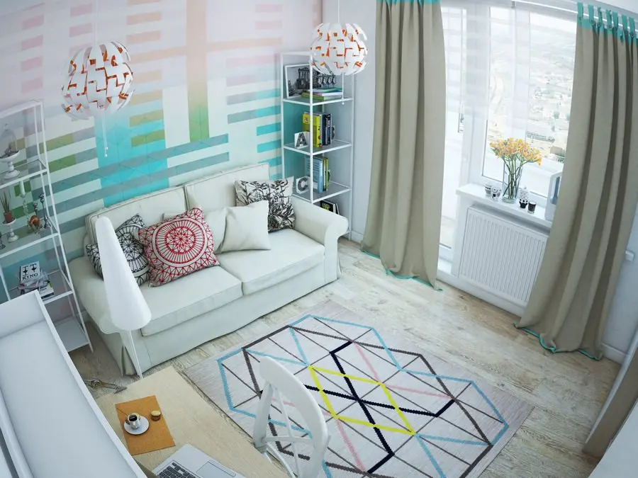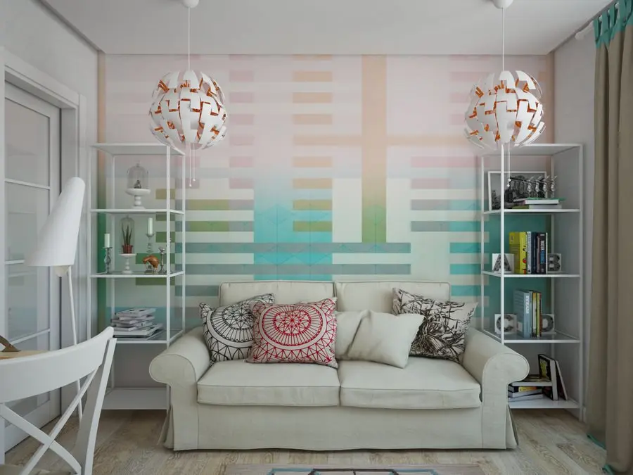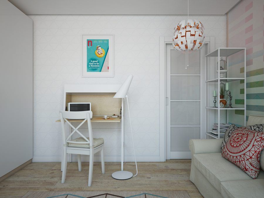 De remarcat cum designerii au ales sa distraga atentia prin diferite elemente cum ar fi corpurile de iluminat suspendate, tapetul de care mentionam mai devreme sau imprimeul pernelor decorative si al covorasului din centrul camerei. De asemenea, pentru a mai economisi spatiu, in locul unei usi batante, s-a optat pentru una glisanta.