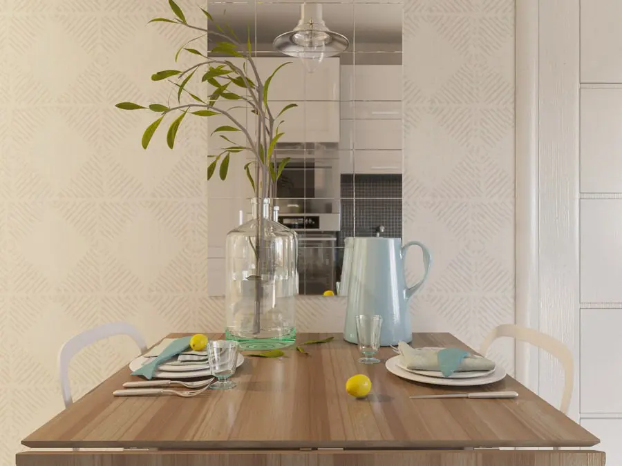 Desi din descriere, spatiul pare ingramadit si aglomerat, ordinea impusa de simetriile geometrice ale pieselor de mobilier corecteaza minusul acestui apartament. In plus, aceasta simetrie este intrerupta de modelul tapetului de pe peretele cu canapeaua. Avem un soi de perete-accent compus dintr-un joc aparent haotic al unor alte forme geometrice.