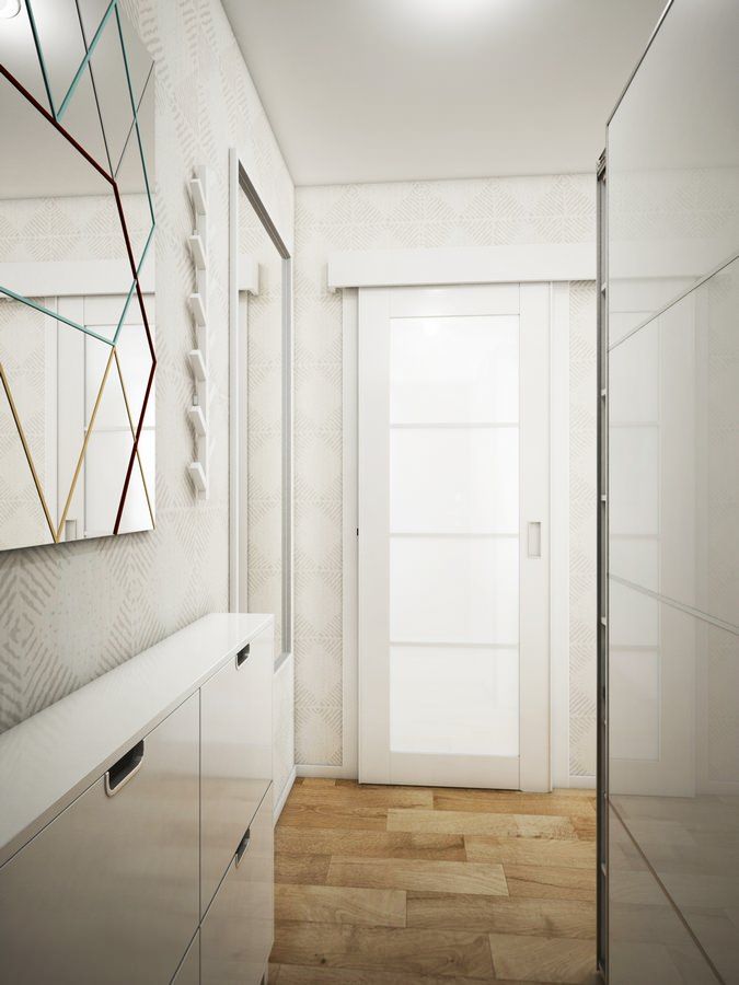 Holul este ingust, dar, cu toate acestea, s-a reusit integrarea unui dulap cu usi glisante si a unui pantofar. Jocul formelor geometrice le regasim si in acest spatiu (vezi oglinda si cuierul) precum si modelul discret al tapetului, realizand o coeziune la nivelul intregii amenajari.