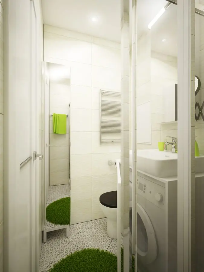 Spatiul baii masina de spalat a fost integrata in locul lavoarului; doar un cadru de lemn asigura separarea intre masina si chiuveta