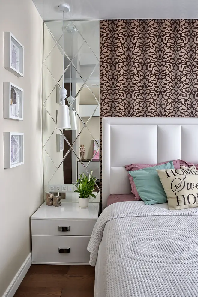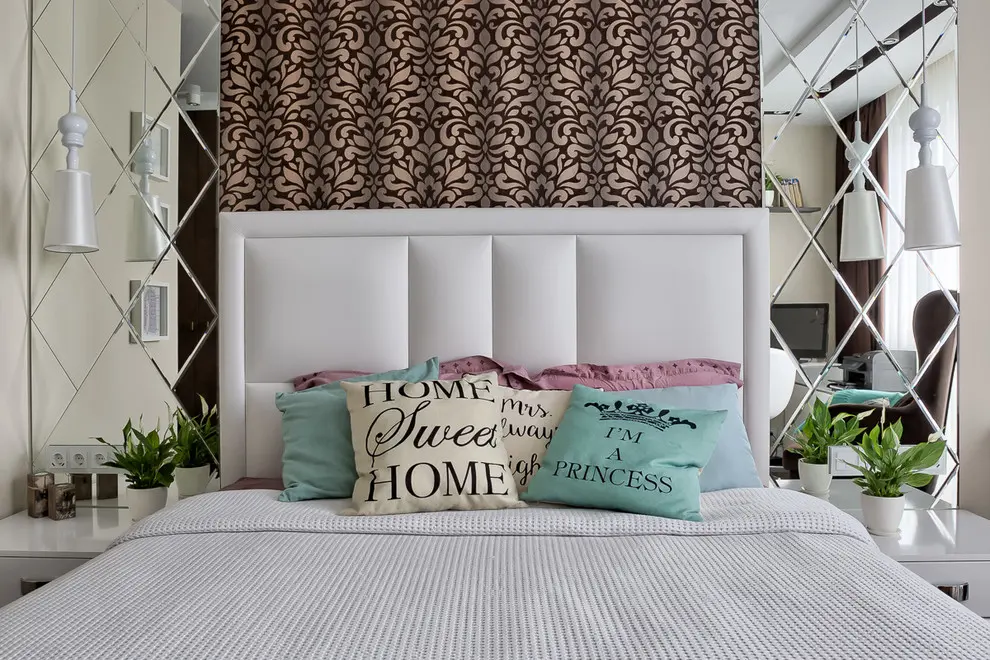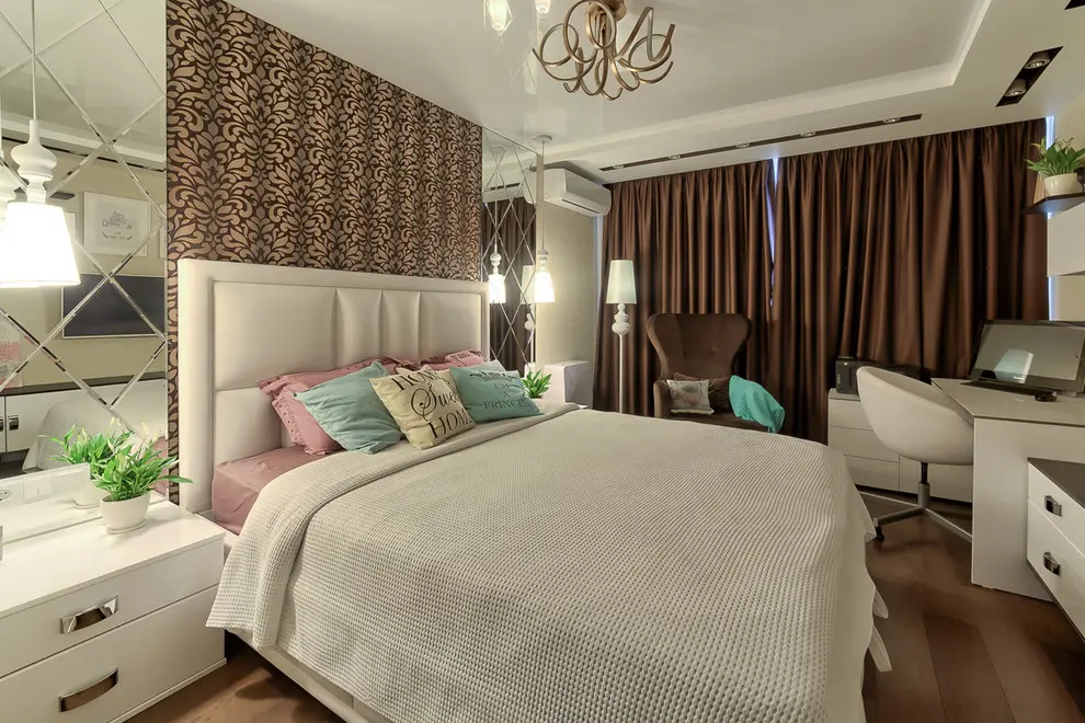 Dormitorul matrimonial adauga intregii amenajari o nota clasica, eleganta si in acelasi timp romantica, imbinand caracteristici ale stilului feminin cu cel masculin. Intalnim aici o tapetare murala cu oglinzi careia i se adauga o nota geometrica. Tablia de mari dimensiuni a patului pozitionat central se aseaza pe un perete cu aspect de falduri si ornamentat cu forme florale.