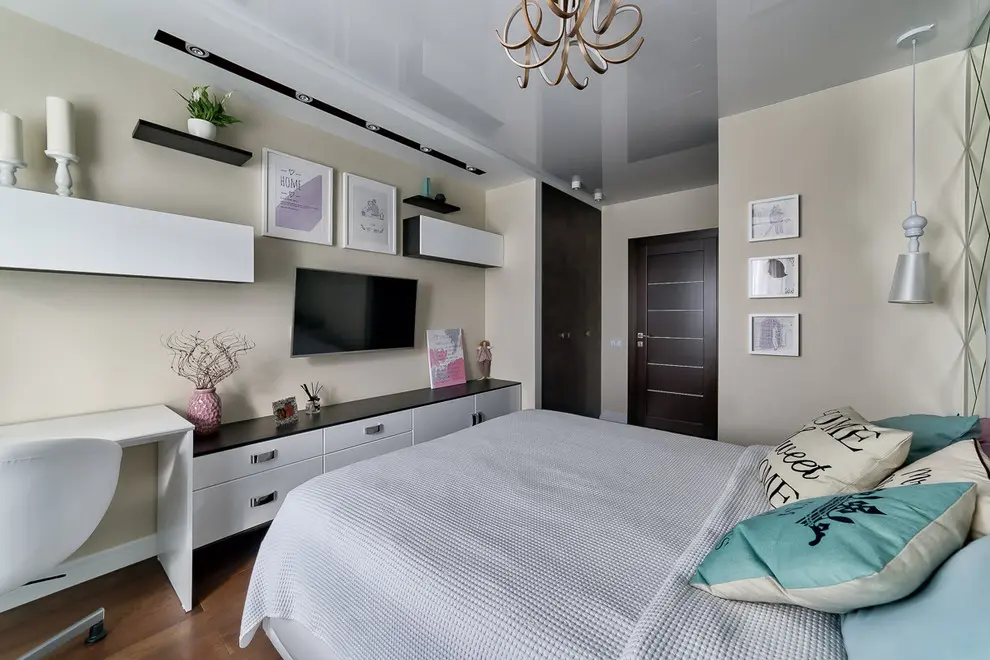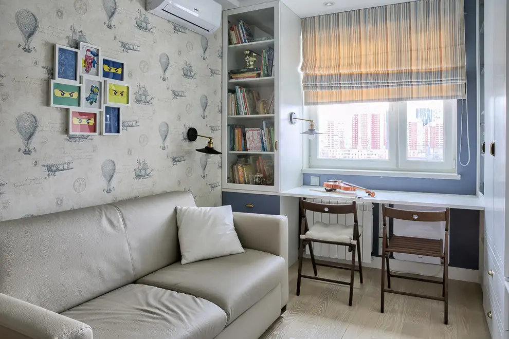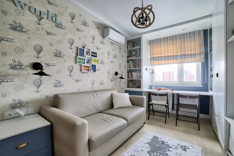 Cea de a doua camera de tineret, este calmata din punct de vedere vizual prin folosirea nuantelor deschise si pastelate, singurele accente evidentiate fiind peretele tapetat pe care se pozitioneaza canapeaua si patternul jaluzelelor. Mobilierul este simplu, compact si functional, design-ul acestuia asigurand posibilitatea crearii unui spatiu de lucru.