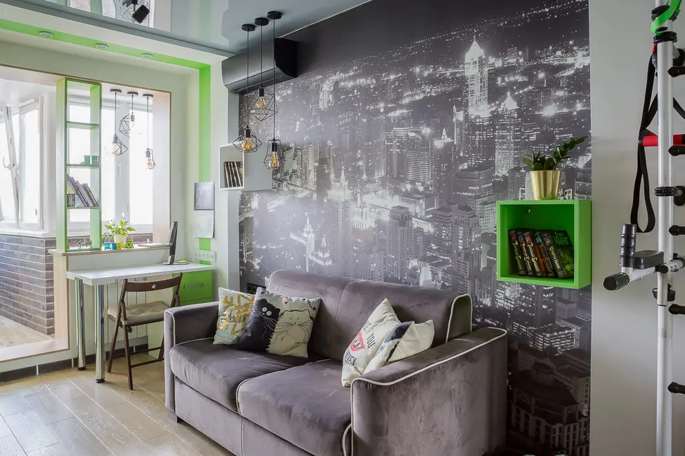 Din punct de vedere cromatic, verdele aprins este cel care inunda camera, fiind pata de culoare ce se remarca printre accentele de gri si negru mural. Mobilierul este unul minimalist si se compune dintr-o biblioteca, o canapea extensibila, spatii pentru birou si spatii pentru relaxare care se intind si in interiorul balconului organizat ca o prelungire a acestei camere.