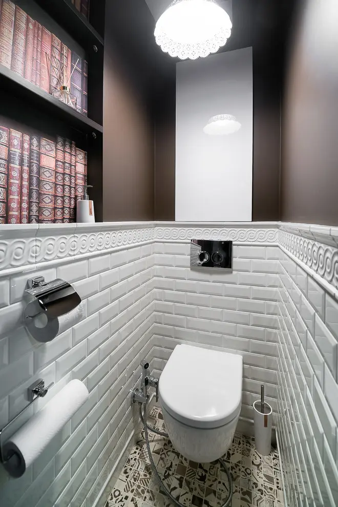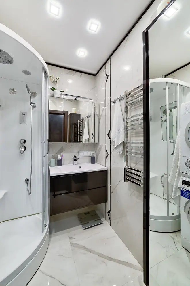 Baia de serviciu se diferentiaza prin folosirea tapetului ca si punct de interes. In acest caz, aspectul de caramida al placilor de faianta impreuna cu linia elegantana lustrei, contureaza per general, un aspect intim. Baia principala pune accent pe spatiu si luminozitate, amenajarea sa fiind una cu caracter practic, esteticul bazandu-se doar pe folosirea non-culorilor.