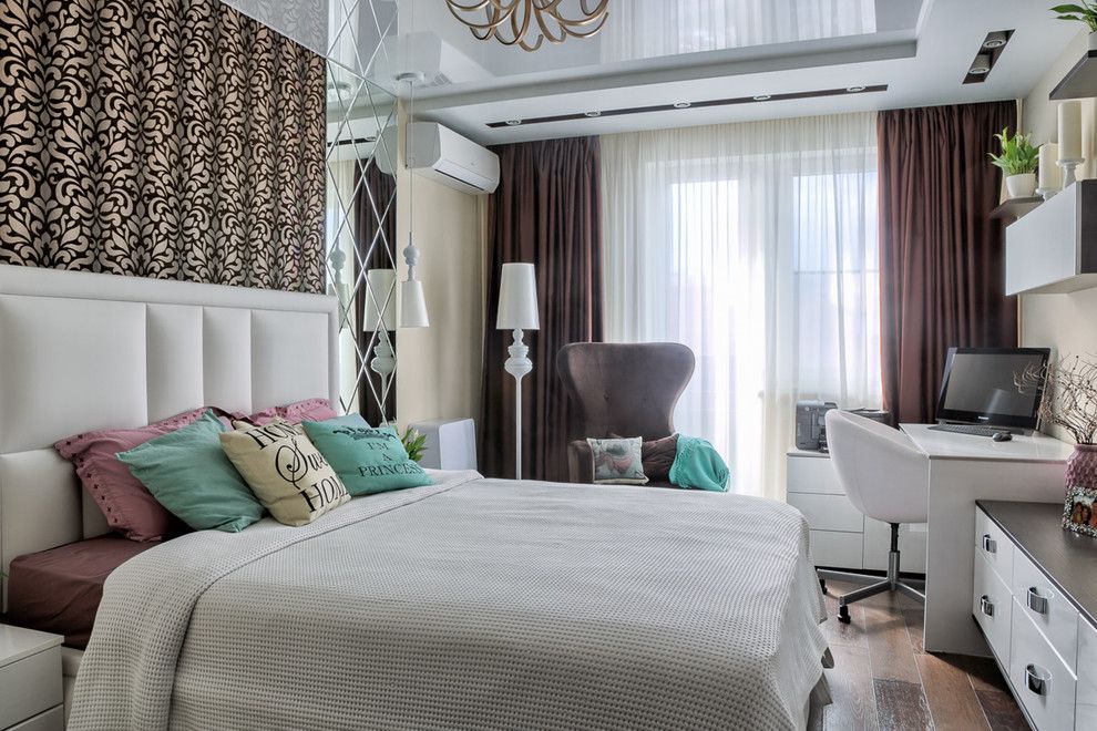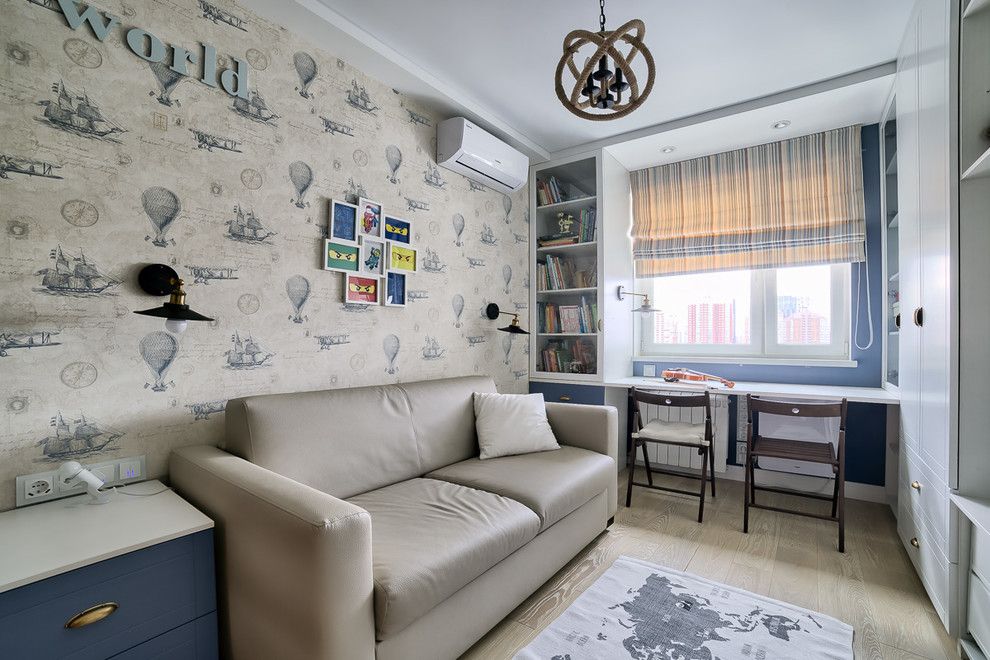 Cea de a doua camera de tineret, este calmata din punct de vedere vizual prin folosirea nuantelor deschise si pastelate, singurele accente evidentiate fiind peretele tapetat pe care se pozitioneaza canapeaua si patternul jaluzelelor. Mobilierul este simplu, compact si functional, design-ul acestuia asigurand posibilitatea crearii unui spatiu de lucru.