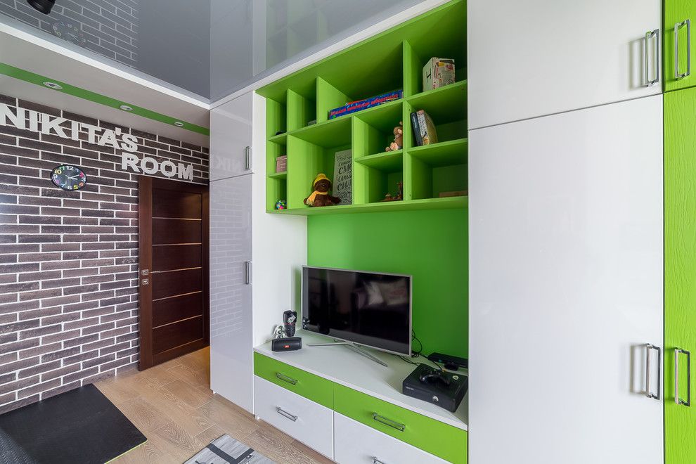 Din punct de vedere cromatic, verdele aprins este cel care inunda camera, fiind pata de culoare ce se remarca printre accentele de gri si negru mural. Mobilierul este unul minimalist si se compune dintr-o biblioteca, o canapea extensibila, spatii pentru birou si spatii pentru relaxare care se intind si in interiorul balconului organizat ca o prelungire a acestei camere.