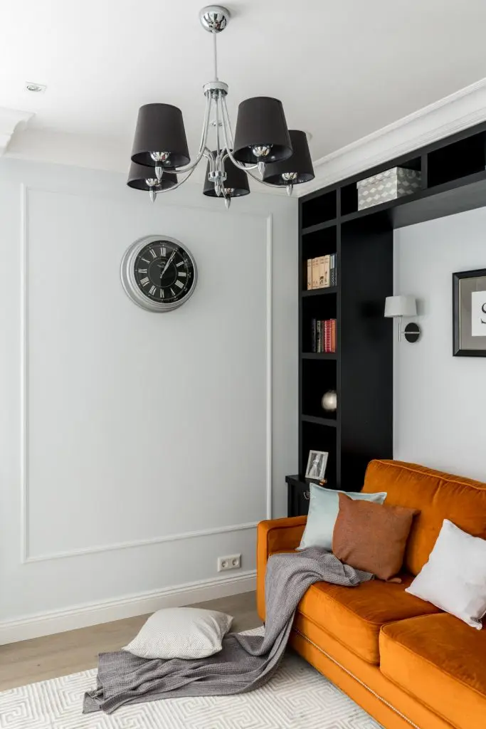 In living, contrastul alb-negru cu accentul de oranj reuseste sa distraga atentia de la configuratia de lung si ingust a camerei. Corpurile de mobilier dispuse de o parte si cealalta a canapelei, cele doua fotolii si masuta sunt elementele care populeaza livingul. O alegere optima a detaliilor care atrag atentia prin designul rafinat, in spiritul dorit al amenajarii.