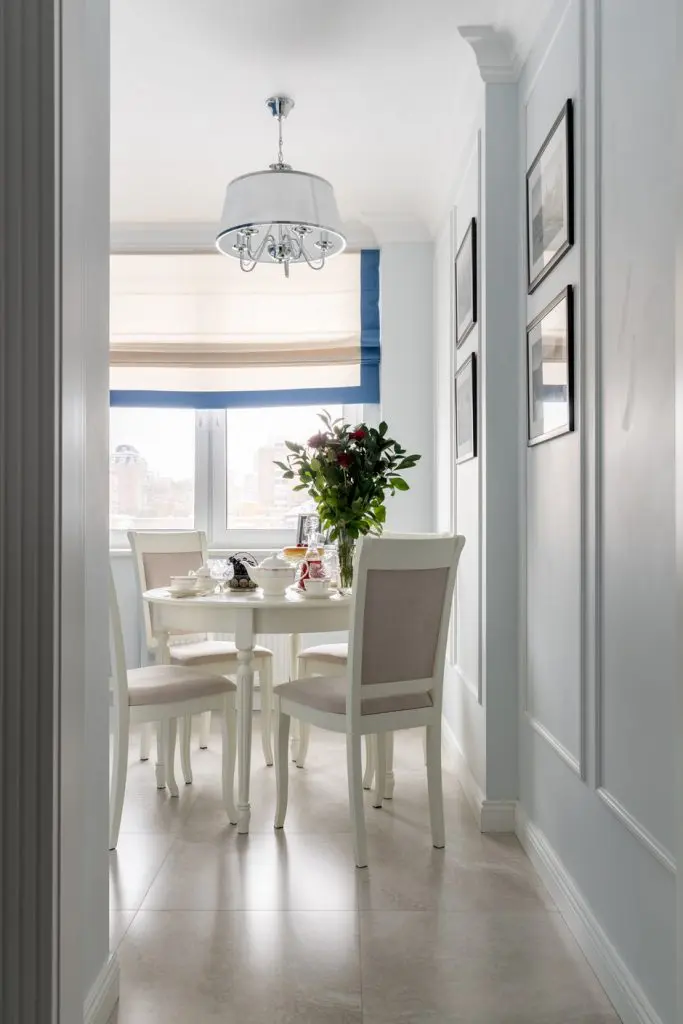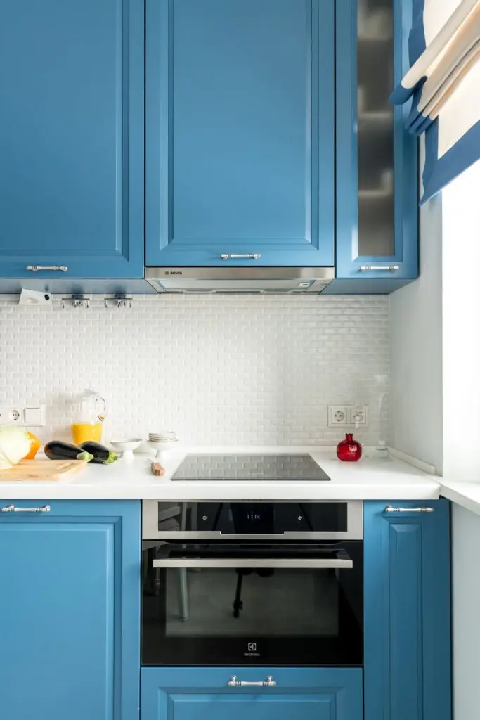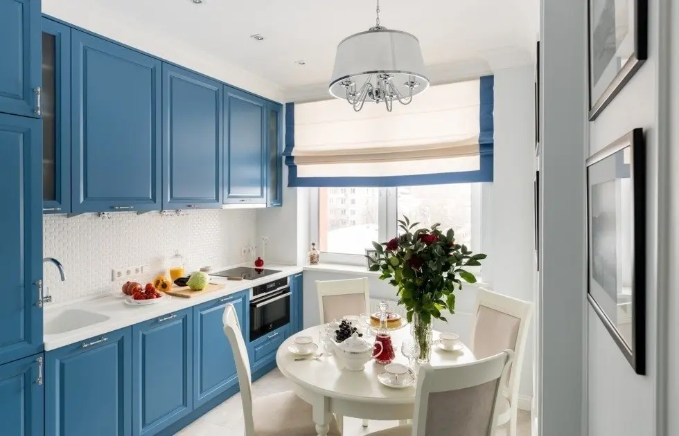 Bucataria este prima incapere vizibila din hol. In suprafata de 9 metri patrati, au fost integrate toate piesele necesare pentru o functionare optima, inclusiv o zona eleganta de luat masa; zonele de lucru sunt dispuse liniar, incorporand si electrocasnicele. Albastrul frontului iese in evidenta si se asociaza armonios cu o draperie in stil roman. In rest, spatiul se pastreaza neutru, cu alb si griuri foarte deschise pentru a amplifica luminozitatea.