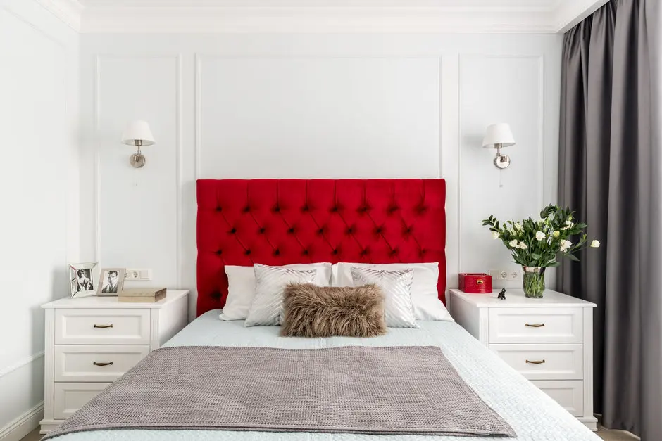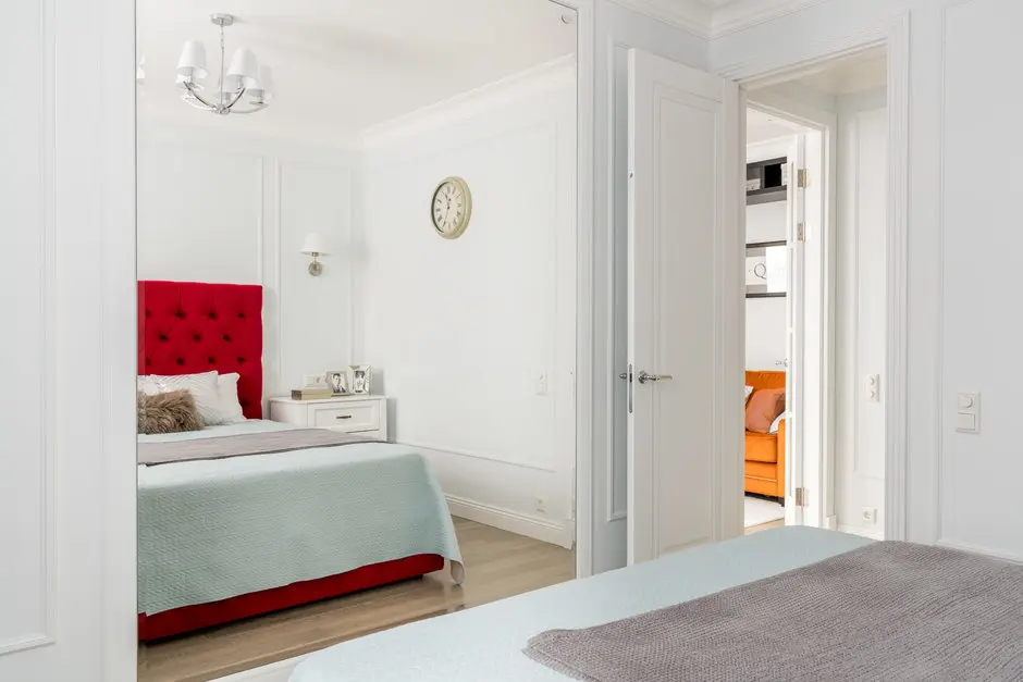 Pentru dormitorul de 11 metri patrati s-a mizat pe aceeasi linie minimala, depozitarea fiind eliminata din acest spatiu. Astfel, camera ramane aerisita si permite un pat matrimonial foarte confortabil. Elementul de accent care schimba intreg decorul este cadrul patului si cu tablia tapitata cu un material rosu. Profilele decorative folosite pe pereti imprima eleganta amenajarii si completeaza armonios designul patului si noptierelor. Un rol important il joaca si oglinda asezata pe peretele din fata patului, care prin pozitionare imprima un efect de largire a spatiului.