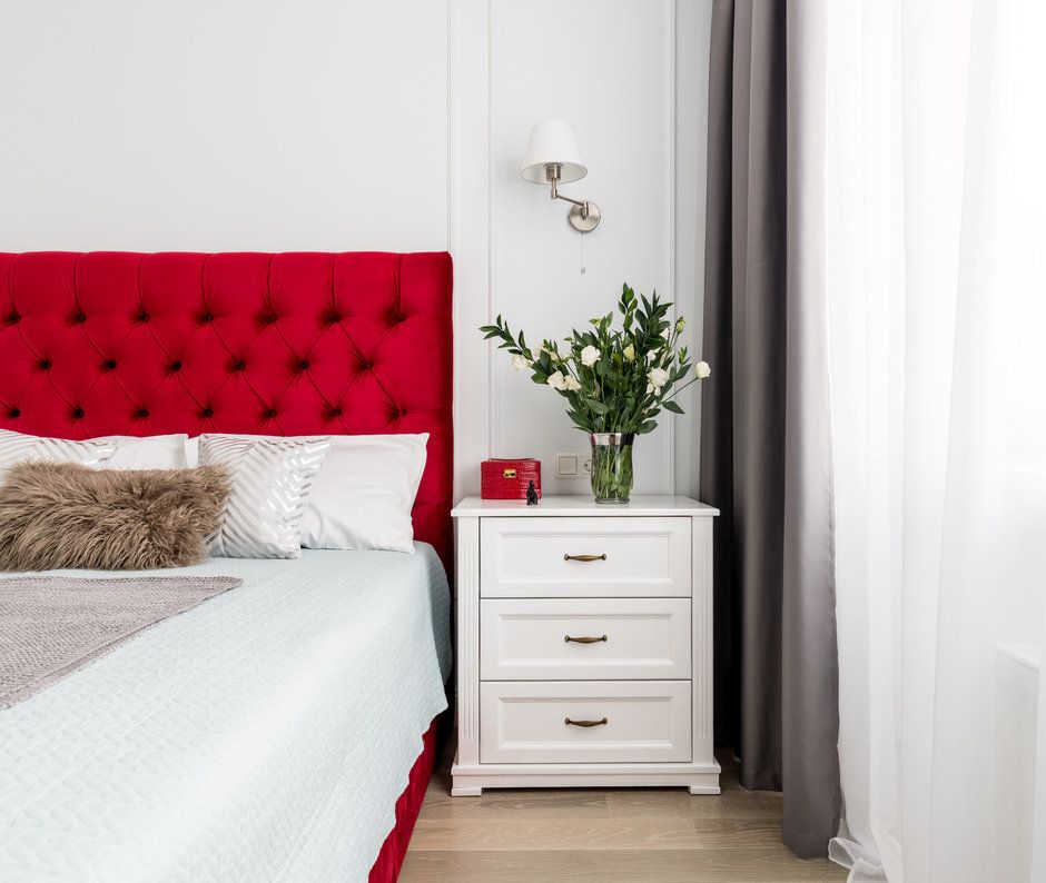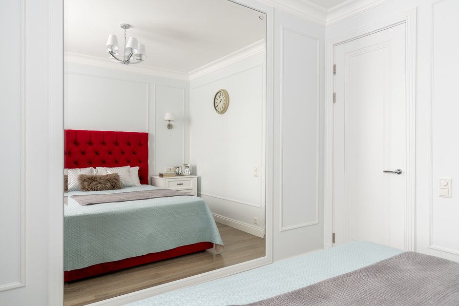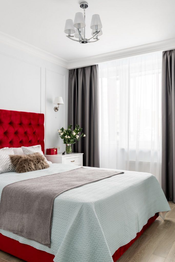 Pentru dormitorul de 11 metri patrati s-a mizat pe aceeasi linie minimala, depozitarea fiind eliminata din acest spatiu. Astfel, camera ramane aerisita si permite un pat matrimonial foarte confortabil. Elementul de accent care schimba intreg decorul este cadrul patului si cu tablia tapitata cu un material rosu. Profilele decorative folosite pe pereti imprima eleganta amenajarii si completeaza armonios designul patului si noptierelor. Un rol important il joaca si oglinda asezata pe peretele din fata patului, care prin pozitionare imprima un efect de largire a spatiului.