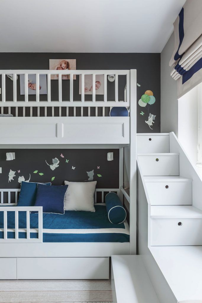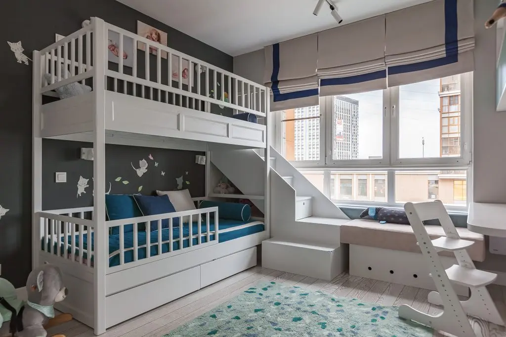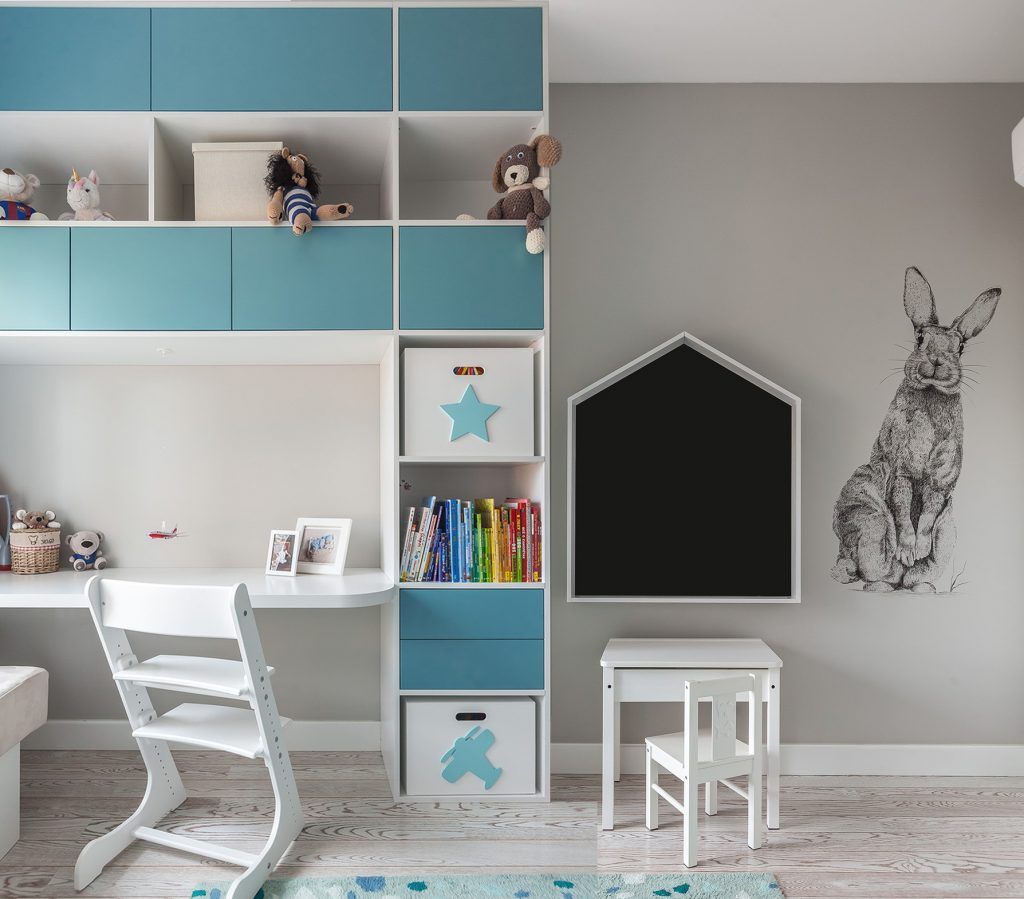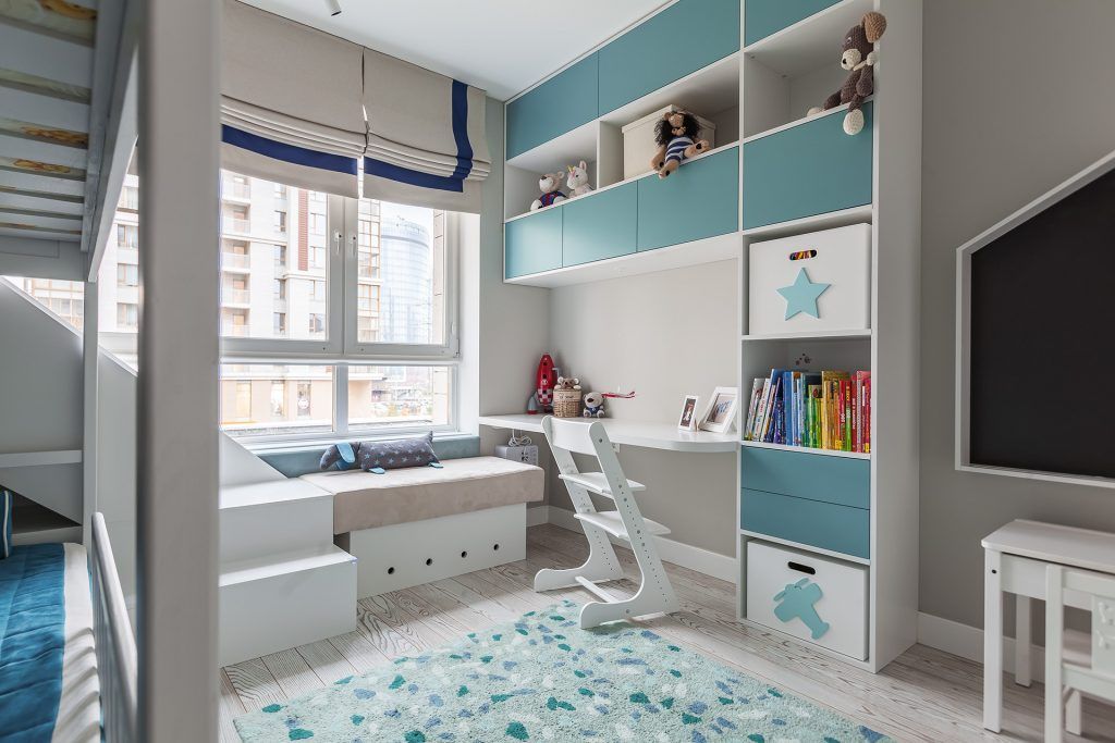 In camera copiilor a fost redata o atmosfera ludica, un spatiu de poveste, fara a deveni prea incarcat insa. Finisajul peretilor este din vopsea magnetica, o solutie ideala pentru copii. Optand pentru mobilier realizat la comanda, au reusit sa exploateze fiecare centimetru patrat, cu solutii de depozitare ingenioase.