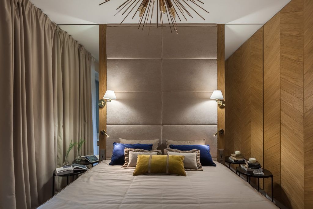Unul dintre trucurile folosite in amenajare este utilizarea oglinzilor in aproape fiecare zona pentru a mari vizual spatiul disponibil si a adauga un efect decorativ pretios. In dormitorul matrimonial au fost folosite oglinzi pe lateralele capataiului patului, in care se reflecta armonios tapetul de pe peretele opus.