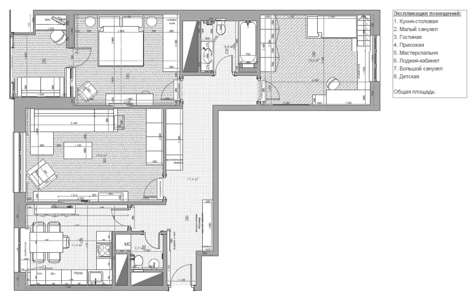 Apartamentul este dispus in forma literei ‘L’, fiecare camera avand acces din hol. Langa intrare este amplasat grupul sanitar si bucataria inchisa, livingul si apoi zona de noapte cu cele doua dormitoare despartite printr-o baie generoasa. Din dormitorul matrimonialse trece in logia care a fost amenajata ca birou.