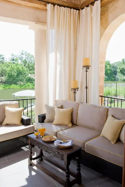 Exemplul 13 Draperiile instalate pe veranda pot regla foarte bine nivelul de lumina care patrunde in acest spatiu. Daca vrei sa creati o atmosfera mai intima putei sa va montati o draperie.