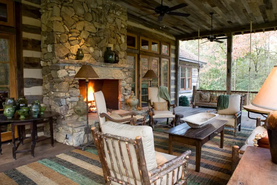 Exemplul 1 In aceasta veranda rustica putem vedea numeroase texturi interensate date de obiectele din lemn, dar si un semineu care echilibreaza spatiul din punt de vedere estetic. Aceasta veranda “vorbeste” despre acea atmosfera confortabila in care famila se intalneste in jurul semineului in noptile racoroase.