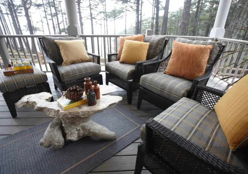 Exemplul 10 Cand decorati pridvorul nu va fie teama sa amestecati diferite tipuri de mobilier cu alte accesorii. Perdelele, mobilierul de rachita si masuta de cafea din lemn pot reprezenta imbinarea ideala pentru acest spatiu.