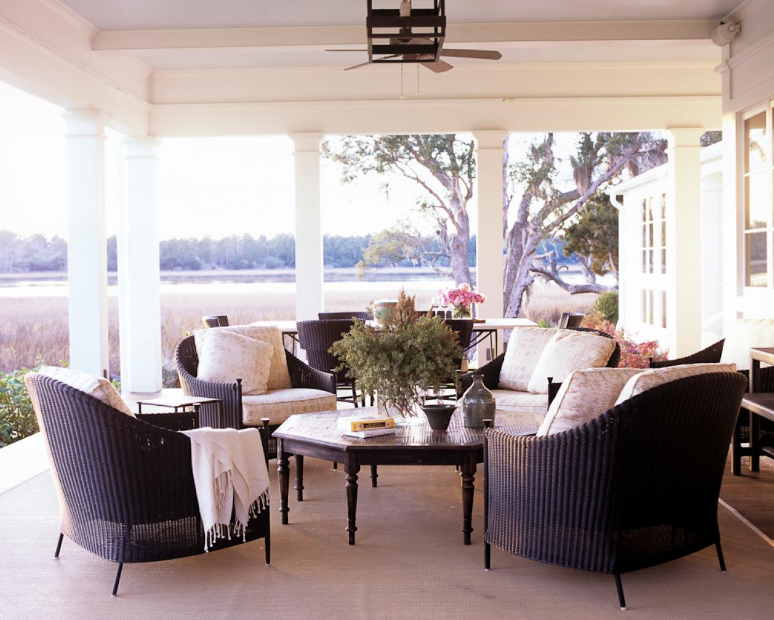 Exemplul 10 Cand decorati pridvorul nu va fie teama sa amestecati diferite tipuri de mobilier cu alte accesorii. Perdelele, mobilierul de rachita si masuta de cafea din lemn pot reprezenta imbinarea ideala pentru acest spatiu.