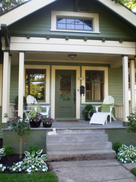 Exemplul 12 Pentru acest pridvor verdele este culoarea definitorie. Acesta culorea este distribuita proportional pe toata cladirea iar nuanta placuta face ca locuinta sa se integreze bine in decorul natural al zonei.