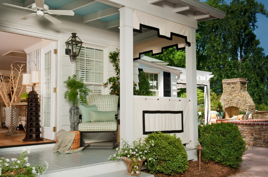 Exemplul 13 Draperiile instalate pe veranda pot regla foarte bine nivelul de lumina care patrunde in acest spatiu. Daca vrei sa creati o atmosfera mai intima putei sa va montati o draperie.