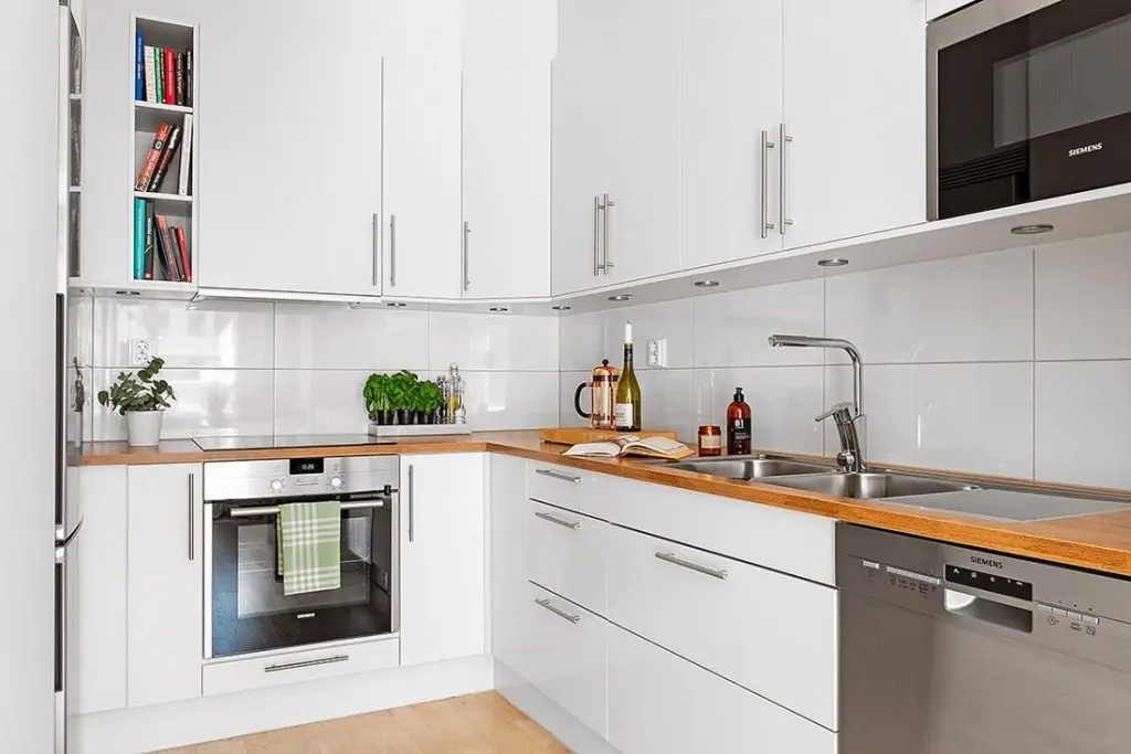 Bucataria, ca pozitionare, se afla intr-un con de umbra. Albul dulapurilor si iluminatul artificial reduc din lipsa luminii naturale. Configurata pe doua laturi, amenajarea asigura cele necesare, incluzand si electrocasnicele. Designul este simplu, cu blat din lemn de stejar si faianta alba, cu placi dreptunghiulare.