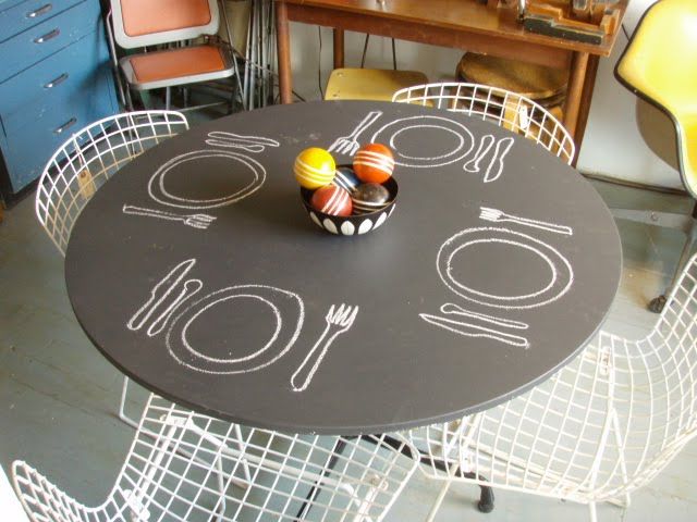 Daca te-ai plictisit de masa din dining sau de cea din bucatarie, da-i un nou aspect cu vopseaua de tabla scolara. Adauga niste scaune albe si redecorarea este gata. Foloseste un smirghel pentru a slefui suprafata mesei si aplica doua straturi de vopsea de tabla scolara. Lasa sa se usuce bine timp de trei zile si apoi o poti folosi cu incredere.