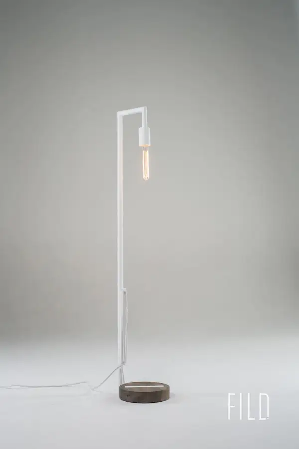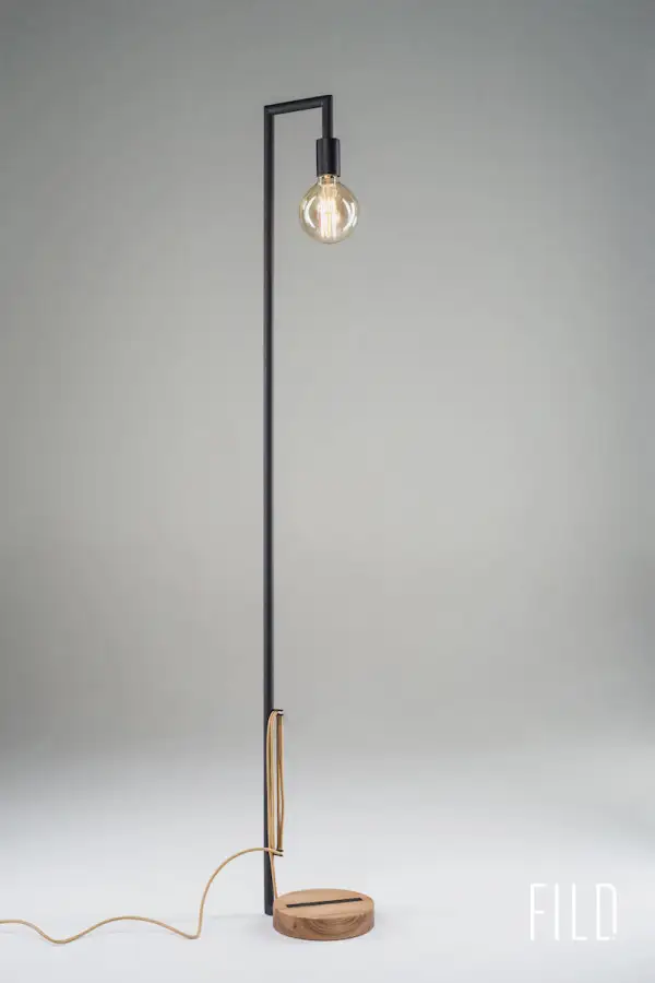 Designul extrem de minimalist al lampii este intrigant: o bara metalica, indoita la capat pentru a putea fixa becul si o baza de lemn de suport la baza acesteia. Firul din material textil poate fi customizat, clientul putand alege diferite culori. Lampa se porneste cu ajutorul unui senzor, localizat la baza lampii.