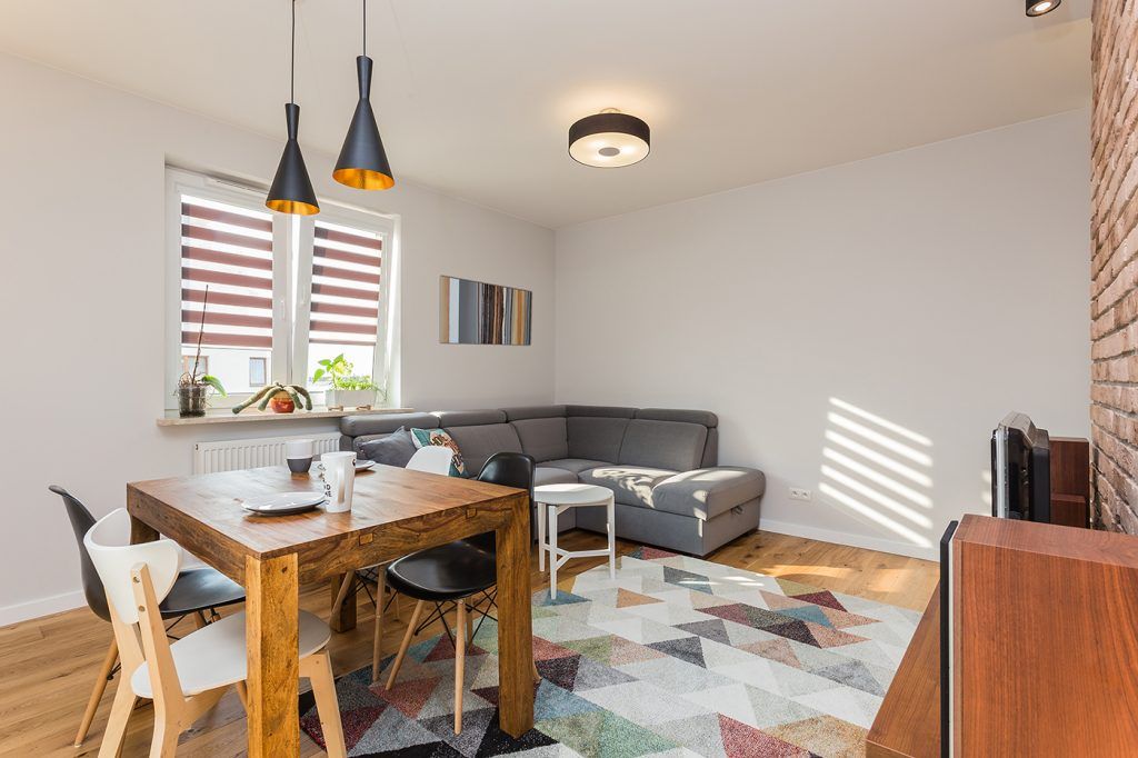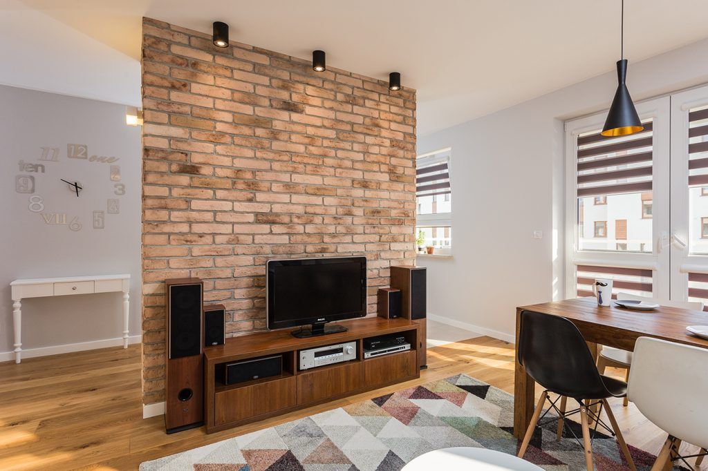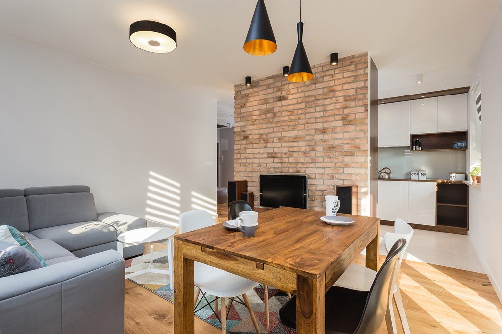 Partitia care separa vizual bucataria de living este placata cu caramida, creand textura si culoare la nivelul decorului. Este un soi de punct de interes menit sa atraga atentia. Accesoriile si decoratiunile, precum corpurile de iluminat, covorul, tablourile personalizeaza discret fiecare functiune in parte.