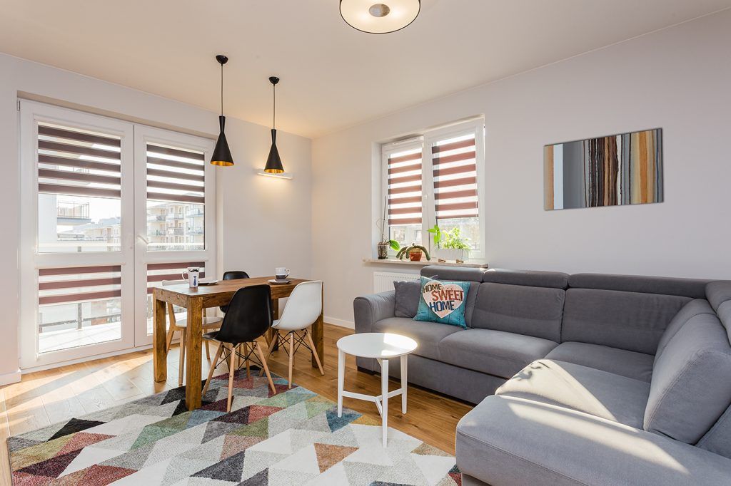 Zona de zi este unitara, cu living, dining si bucatarie, functiunile comunicand armonios intre ele. Amenajarea curata, minimala pare mai fluenta si mai luminoasa. Mobilierul nu agreseaza spatiul; vorbim despre piesele de baza, precum canapeaua tip coltar, masa cu scaunele care compun diningul, un corp mic ca suport pentru televizor si dulapurile din bucatarie. Simplitatea aceasta lasa spatiul sa respire, iar finisajele sa straluceasca prin calitatea lor.