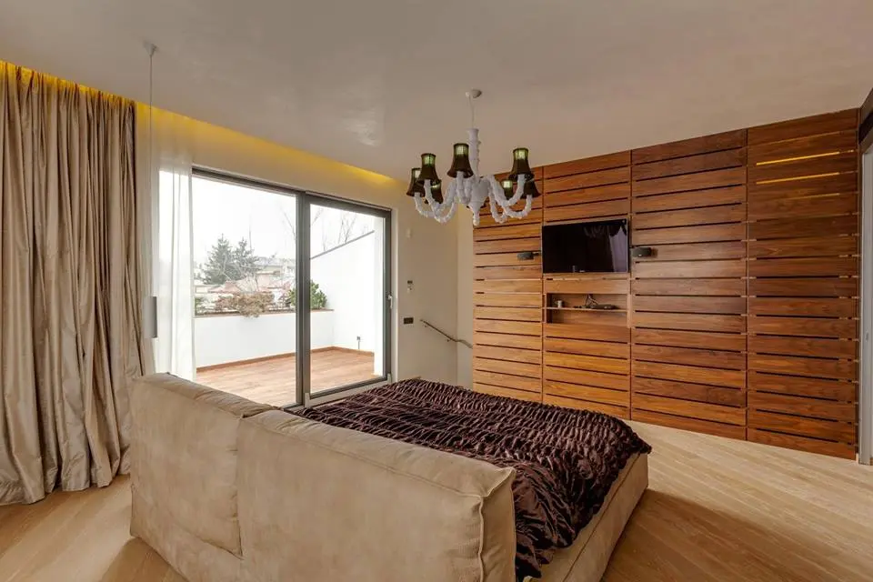 Cand am gandit amenajarea ne-am concentrat pe designul peretilor si luminilor si pe elementele pe care le dorim in spatiu, in acest caz lemnul si piatra. Pornind de la aceste elemente am folosit tapet din piatra, mozaic din lemn, finisaj de stucco, krion pentru bai. Pentru a incalzi si echilibra atmosfera am introdus lemnul de nuc, pielea si catifeaua.