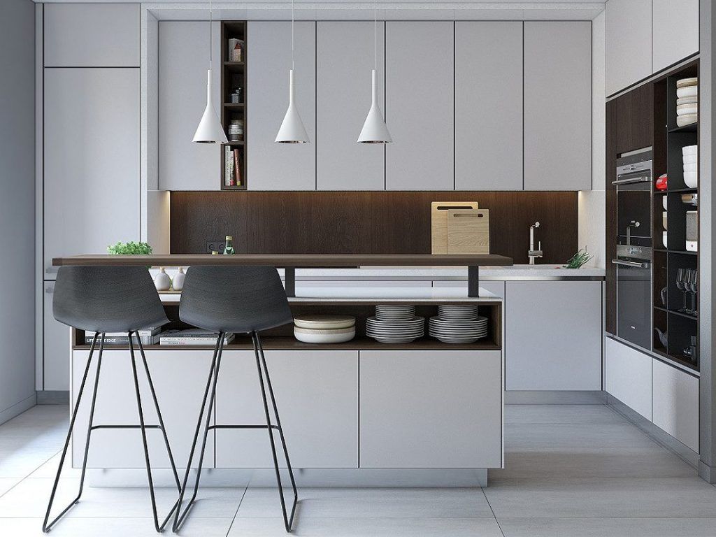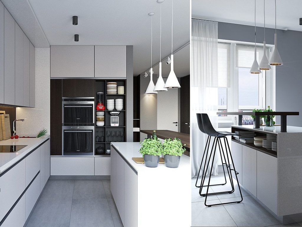 In zona bucatariei predomina aceeasi linie minimalista, cu un design simplu, unitar si coerent. Corpul tip insula de bucatarie joaca un rol multifunctional cu spatii pentru depozitare, zona de bar, zona pentru luat masa, dar si spatiu suplimentar cu blat de lucru. Front lucios, alb, manere frezate, electrocasnice incorporate, toate amintesc de stilistica contemporana descrisa impecabil in intreaga amenajare.