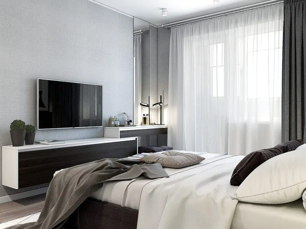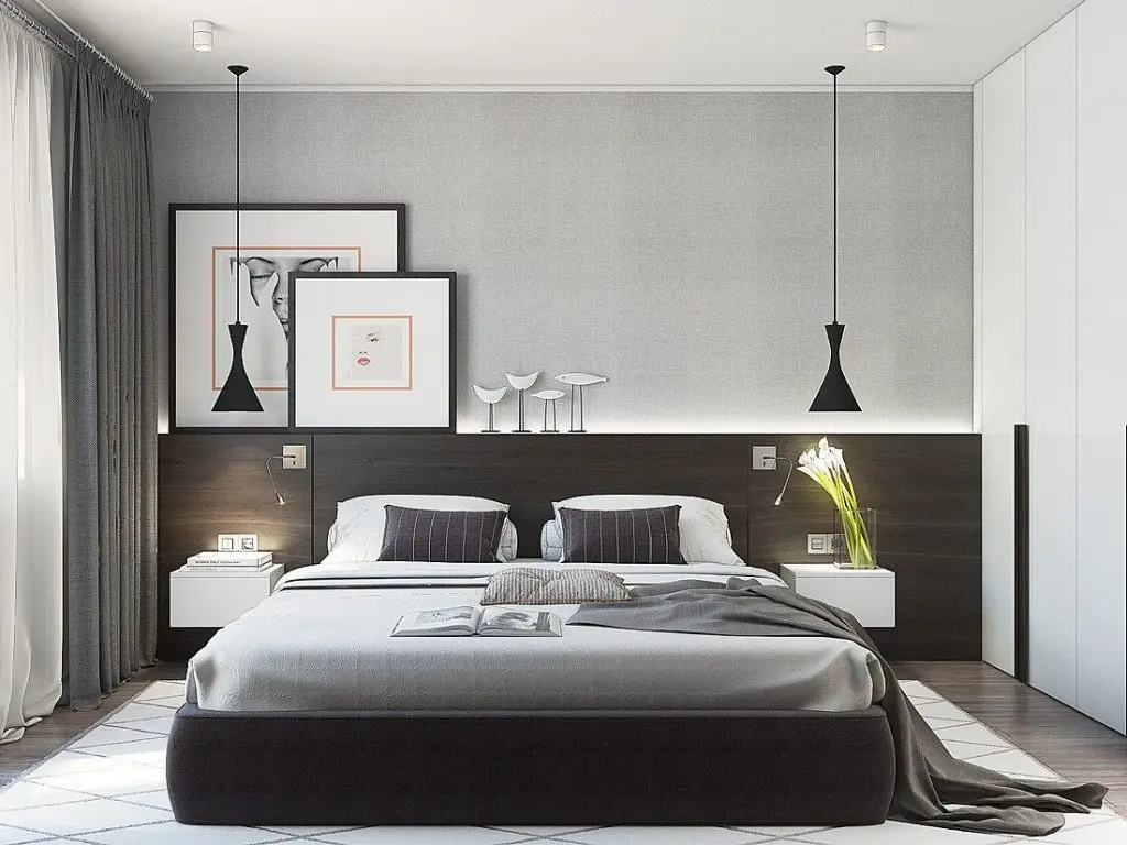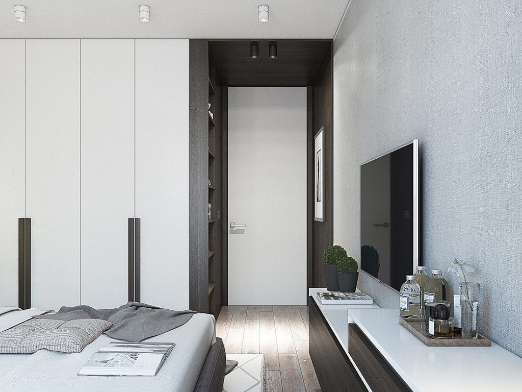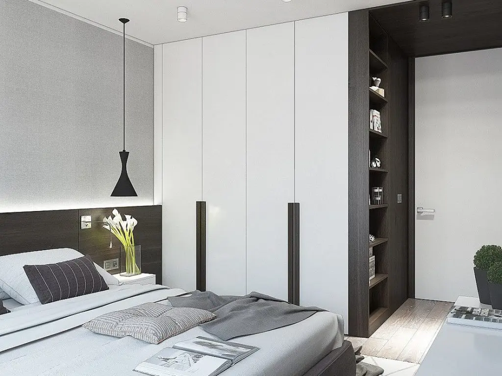 Si pentru dormitor s-a mizat pe aceeasi abordare. Designerul a reusit sa creeze spatii de depozitare generoase dispusa pe doua laturi chiar langa intrarea in camera. De o parte, rafturi deschise incastrate intr-o nisa, de cealalta parte dulapuri inalte pentru haine. Zona patului este subliniata de o tablie ce incorporeaza iluminatul si noptierele, iar cadrul textil aduce un plus de confort.