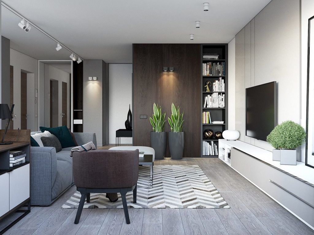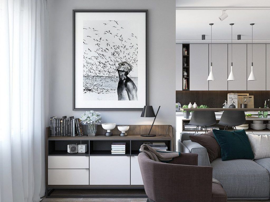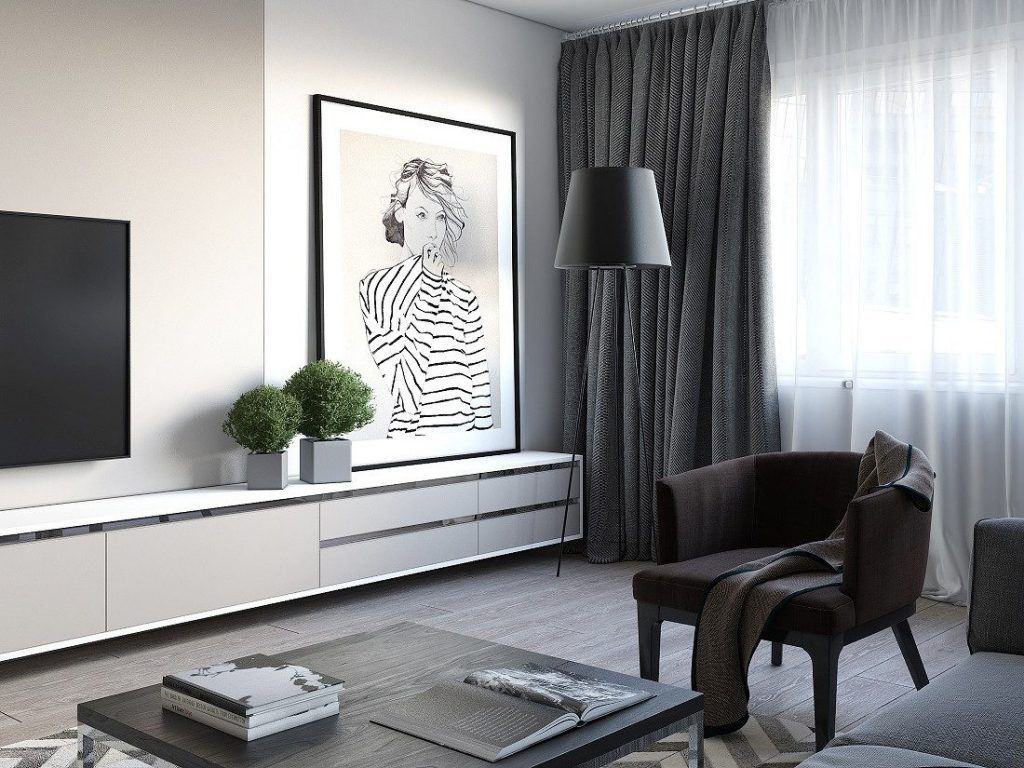 Pentru zona de living, spatiul urmeaza o linie minimalista, cu accent pe volumetrii si piese care ies in evidenta prin design. Accentul este pus pe piesele de baza, cu accesorii si decoratiuni care aduc un plus de personalitate ansamblului. Canapeaua, un otoman si un fotoliu precum si o masuta de cafea cu baza metalica compun o zona de conversatii placuta. Totul este completat cu spatiul destinat televizorului si o comoda lunga cu spatii utile de stocare. Grejurile si marourile predomina. Lumina naturala patrunde din belsug astfel ca totul pare mai amplu si mai spatios.