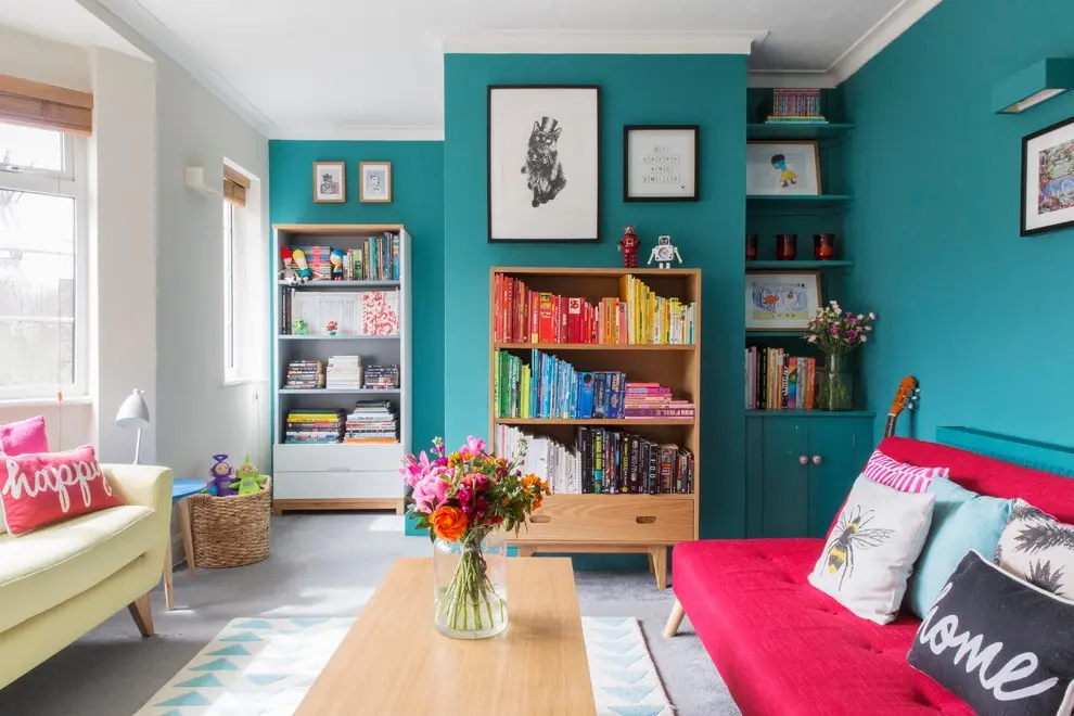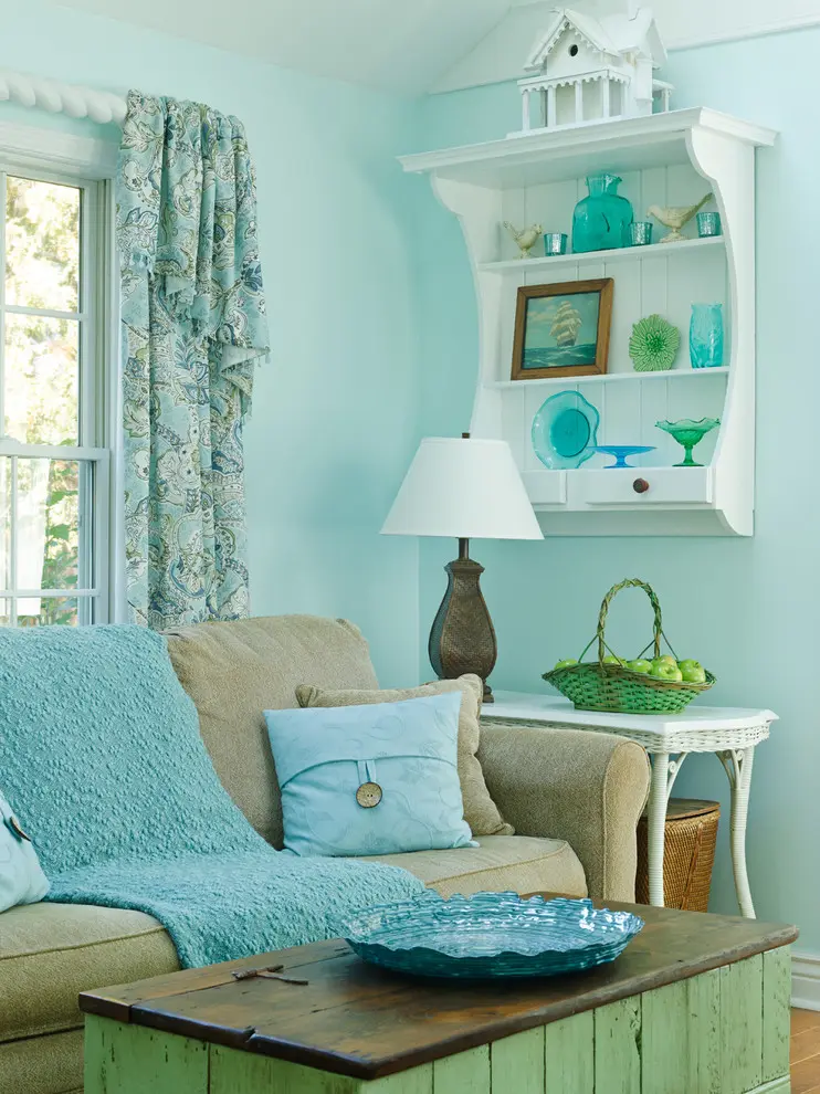 Nuantele deschise de turcoaz se pot folosi pentru a zugravi peretii din camera de zi. Pentru a avea o legatura intre elemente, includeti si alte obiecte sau decoratiuni in nuante asemanatoare. Un abajur, un scaun otoman, tapiteria de la fotolii sau poate un tablou abstract in care turcoazul este predominant, iata doar cateva exemple in acest sens.
